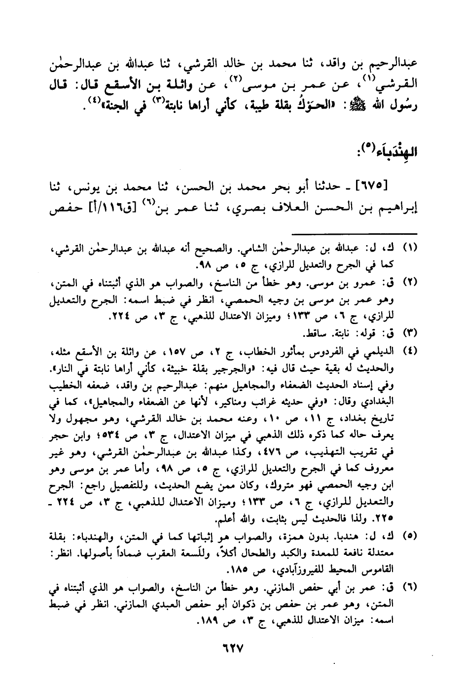 675- حَدَّثَنا أبو بحر محمد بن الحسن، حَدَّثَنا محمد بن يونس، حَدَّثَنا إبراهيم بن الحسن العلاف بصري، حَدَّثَنا عُمَر بن حفص -[628]- المازني، عَن بشر بن عبد الله، عَن جعفر بن محمد، عَن أبيه، عَن جَدِّه الحسين بن علي قال: سمعت رسول الله صَلَّى الله عَليْهِ وَسلَّم يقول: ما من ورقة من ورق الهندباء إلا عليها قطرة من ماء الجنة.