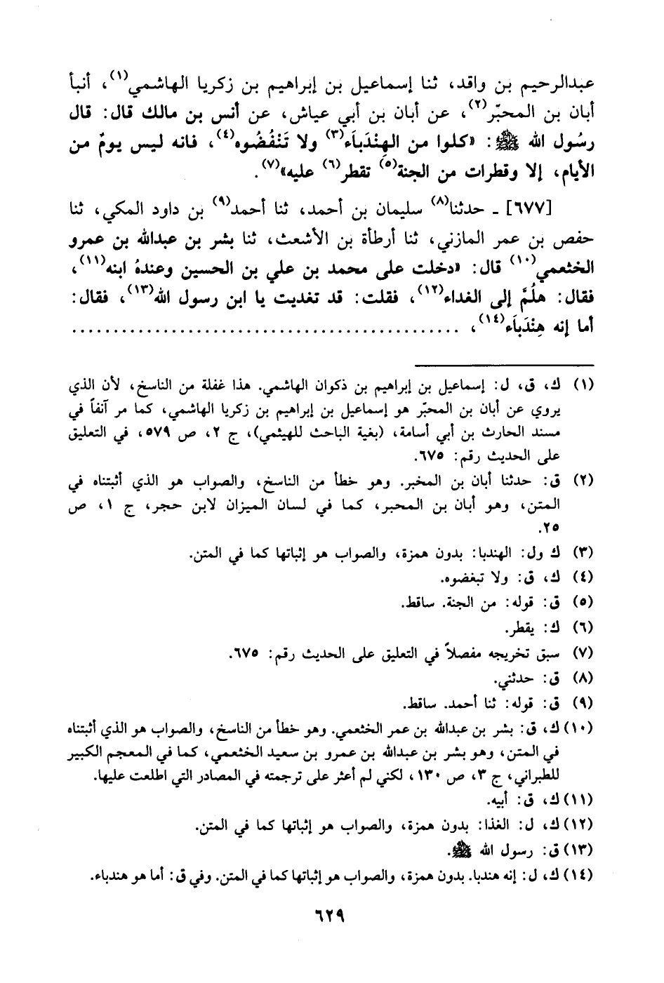 677- حَدَّثَنا سليمان بن أحمد، حَدَّثَنا أحمد بن داود المكي، حَدَّثَنا حفص بن عُمَر المازني، حَدَّثَنا أرطأة بن الأشعث، حَدَّثَنا بشر بن عبد الله بن عَمْرو الخثعمي قال: دخلت على محمد بن علي بن الحسين وعنده ابنه فقال: هلم إلى الغداء فقلت: قد تغديت يا ابن رسول الله فقال: أما إنه هندباء -[630]- فقلت: يا ابن رسول الله وما في الهندباء؟ قال: حدثني أبي، عَن جدي أن رسول الله صَلَّى الله عَليْهِ وَسلَّم قال: ما من ورقة من ورق الهندباء إلا وعليها قطرة من ماء الجنة.