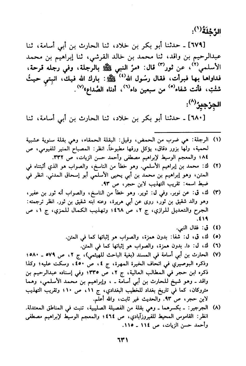 679- حَدَّثَنا أبو بكر بن خلاد، حَدَّثَنا الحارث بن أبي أسامة، حَدَّثَنا عبد الرحيم بن واقد، حَدَّثَنا محمد بن خالد القرشي، حَدَّثَنا إبراهيم بن محمد الأسلمي، عَن ثور قال: مر النبي صَلَّى الله عَليْهِ وَسلَّم بالرجلة وفي رجله قرحة فداواها بها فبرأت فقال رسول الله صَلَّى الله عَليْهِ وَسلَّم: بارك الله فيك انبتي حيث شئت فأنت شفاء من سبعين داء أدناه الصداع.