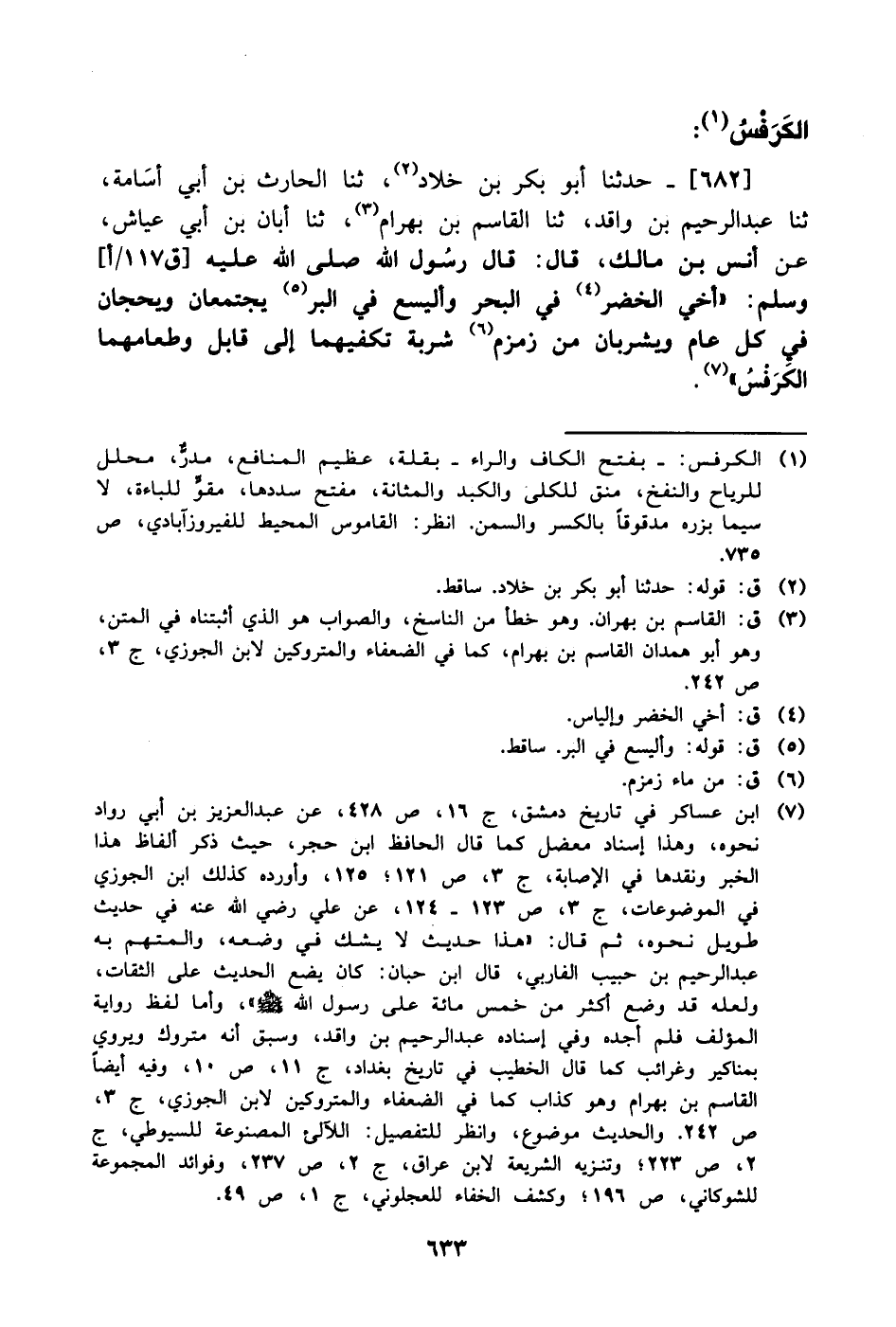 682- حَدَّثَنا أبو بكر بن خلاد، حَدَّثَنا الحارث بن أبي أسامة، حَدَّثَنا عبد الرحيم بن واقد، حَدَّثَنا القاسم بن بهرام، حَدَّثَنا أبان بن أبي عياش، عَن أنس بن مالك، قال: قال رسول الله صَلَّى الله عَليْهِ وَسلَّم: أخي الخضر في البحر وأليسع في البر يجتمعان ويحجان في كل عام ويشربان من زمزم شربة تكفيهما إلى قابل وطعامهما الكرفس.