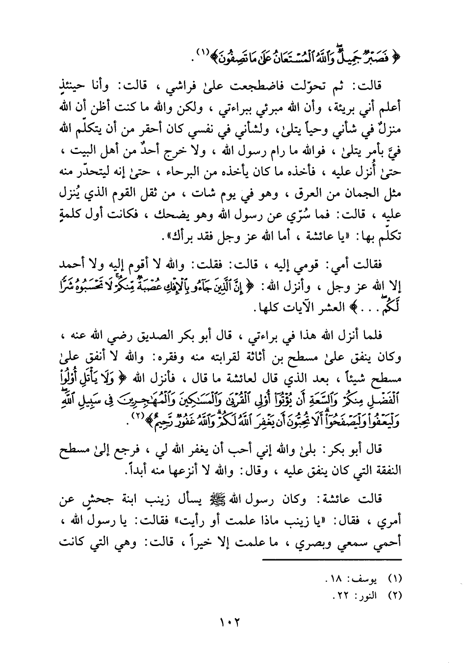 فلما أنزل الله هذا في براءتي، قال أبو بكر الصديق رضي الله عنه، وكان ينفق على مسطح بن أثاثة لقرابته منه وفقره: والله لا أنفق على مسطح شيئا، بعد الذي قال لعائشة ما قال، فأنزل الله (وَلا يَأْتَلِ أُولُوا الْفَضْلِ مِنْكُمْ وَالسَّعَةِ أَنْ يُؤْتُوا أُولِي الْقُرْبى وَالْمَساكِينَ وَالْمُهاجِرِينَ فِي سَبِيلِ اللَّهِ وَلْيَعْفُوا وَلْيَصْفَحُوا أَلا تُحِبُّونَ أَنْ يَغْفِرَ اللَّهُ لَكُمْ وَاللَّهُ غَفُورٌ رَحِيمٌ) (¬2).