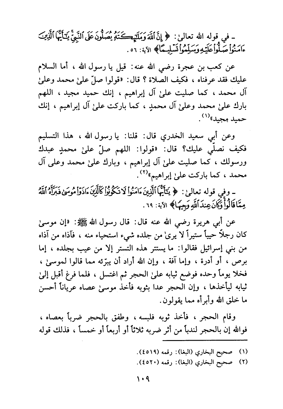 - في قوله الله تعالى: (إِنَّ اللَّهَ وَمَلائِكَتَهُ يُصَلُّونَ عَلَى النَّبِيِّ يا أَيُّهَا الَّذِينَ آمَنُوا صَلُّوا عَلَيْهِ وَسَلِّمُوا تَسْلِيماً) الآية: 56.