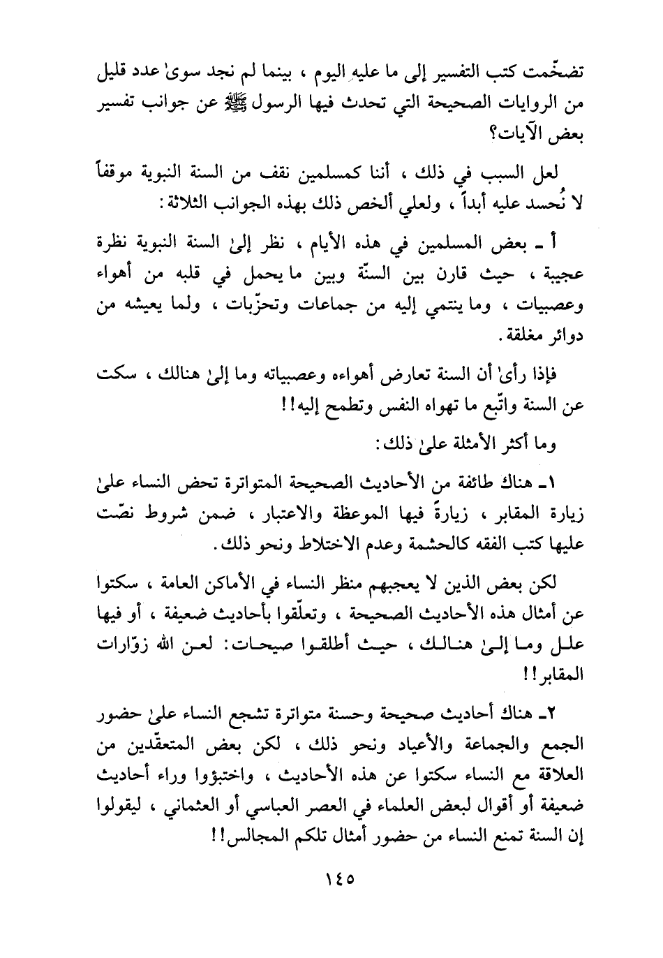 2 - هناك أحاديث صحيحة وحسنة متواترة تشجع النساء على حضور الجمع والجماعة والأعياد ونحو ذلك، لكن بعض المتعقّدين من العلاقة مع النساء سكتوا عن هذه الأحاديث، واختبئوا وراء أحاديث ضعيفة أو أقوال لبعض العلماء في العصر العباسي أو العثماني، ليقولوا إن السنة تمنع النساء من حضور أمثال تلكم المجالس!!