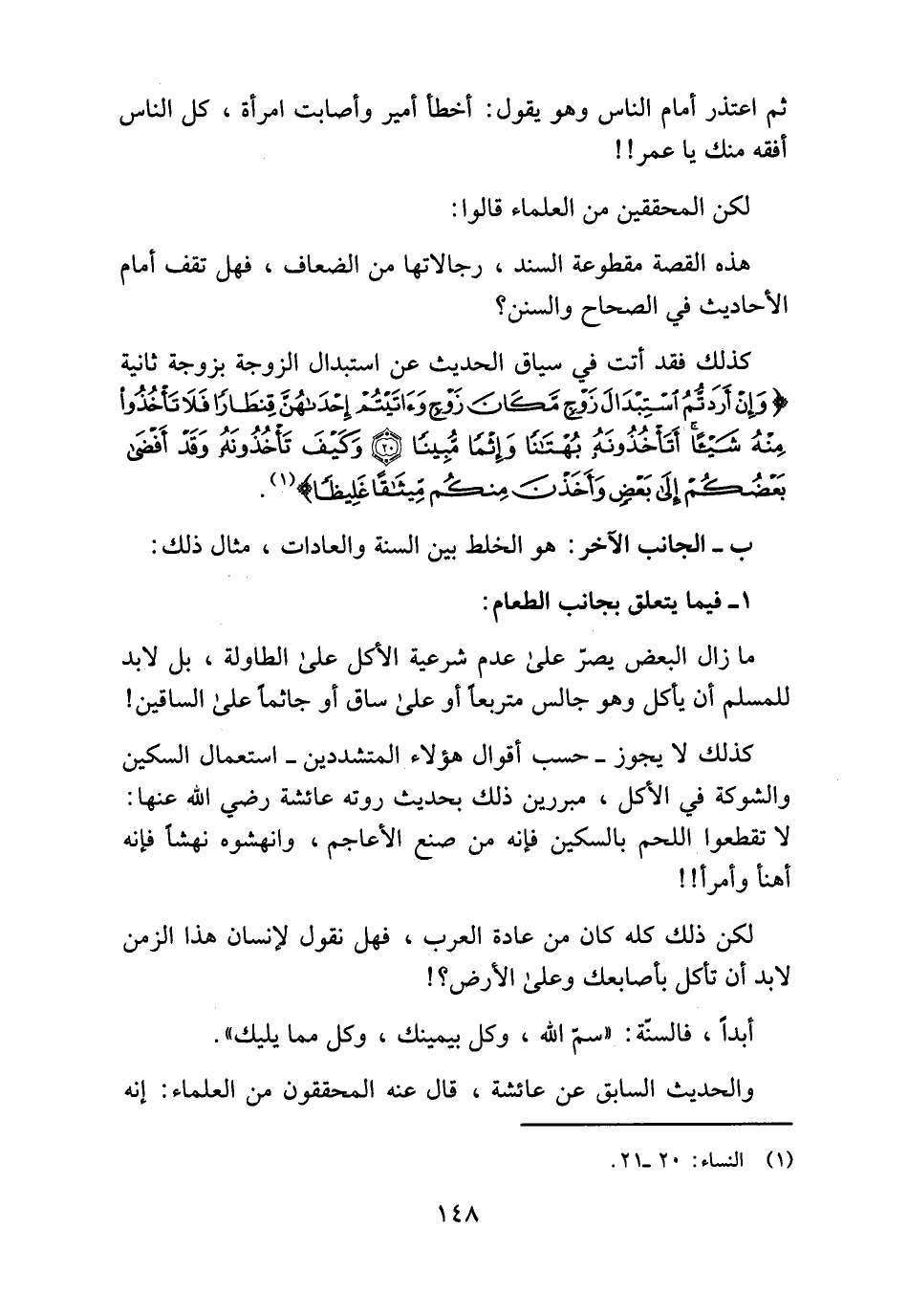 لكن ذلك كله كان من عادة العرب، فهل نقول لإنسان هذا الزمن لا بدّ أن تأكل بأصابعك وعلى الأرض؟!