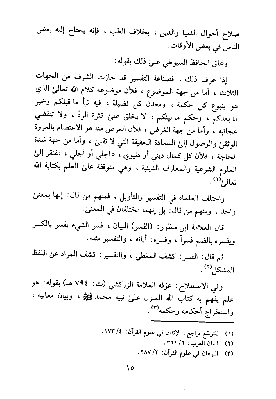 إذا عرف ذلك، فصناعة التفسير قد حازت الشرف من الجهات الثلاث، أما من جهة الموضوع، فلأن موضوعه كلام الله تعالى الذي هو ينبوع كل حكمة، ومعدن كل فضيلة، فيه نبأ ما قبلكم وخبر ما بعدكم، وحكم ما بينكم، لا يخلق على كثرة الردّ، ولا تنقضي عجائبه، وأما من جهة الغرض، فلأن الغرض منه هو الاعتصام بالعروة الوثقى والوصول إلى السعادة الحقيقة التي لا تفنى، وأما من جهة شدة الحاجة، فلأن كل كمال ديني أو دنيوي، عاجلي أو آجلي، مفتقر إلى العلوم الشرعية والمعارف الدينية، وهي متوقفة على العلم بكتابة الله تعالى (¬1).