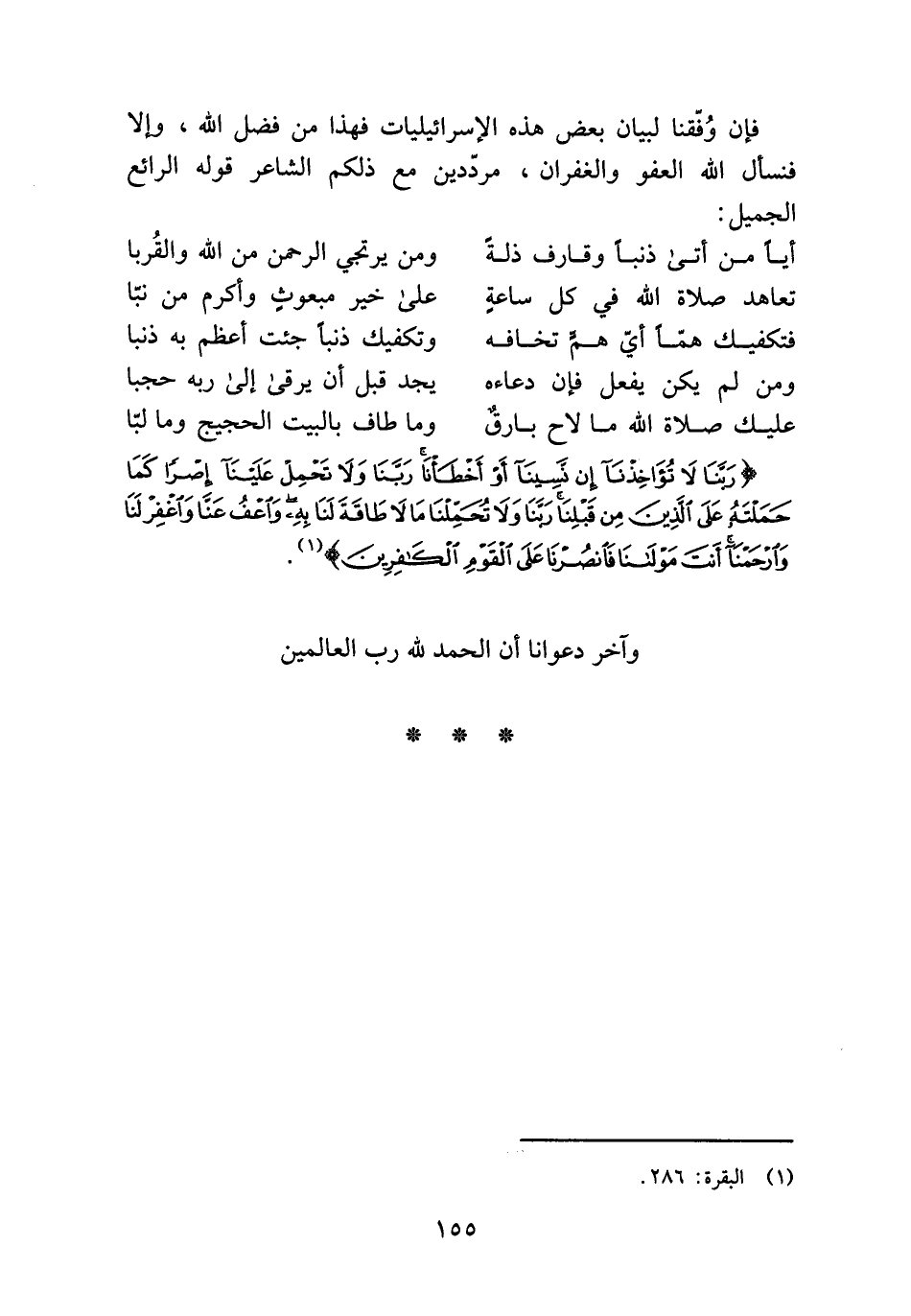 (رَبَّنا لا تُؤاخِذْنا إِنْ نَسِينا أَوْ أَخْطَأْنا رَبَّنا وَلا تَحْمِلْ عَلَيْنا إِصْراً كَما حَمَلْتَهُ عَلَى الَّذِينَ مِنْ قَبْلِنا رَبَّنا وَلا تُحَمِّلْنا ما لا طاقَةَ لَنا بِهِ وَاعْفُ عَنَّا وَاغْفِرْ لَنا وَارْحَمْنا أَنْتَ مَوْلانا فَانْصُرْنا عَلَى الْقَوْمِ الْكافِرِينَ) (¬1).