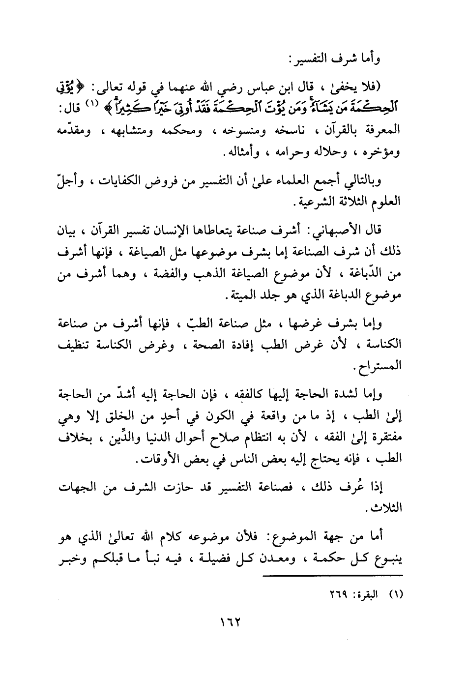 قال الأصبهاني: أشرف صناعة يتعاطاها الإنسان تفسير القرآن، بيان ذلك أن شرف الصناعة إما بشرف موضوعها مثل الصياغة، فإنها أشرف من الدّباغة، لأن موضوع الصياغة الذهب والفضة، وهما أشرف من موضوع الدباغة الذي هو جلد الميتة.