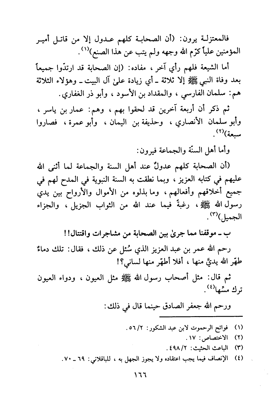 فالمعتزلة يرون: (أن الصحابة كلهم عدول إلا من قاتل أمير المؤمنين عليا كرّم الله وجهه ولم يتب عن هذا الصنع) (¬1).