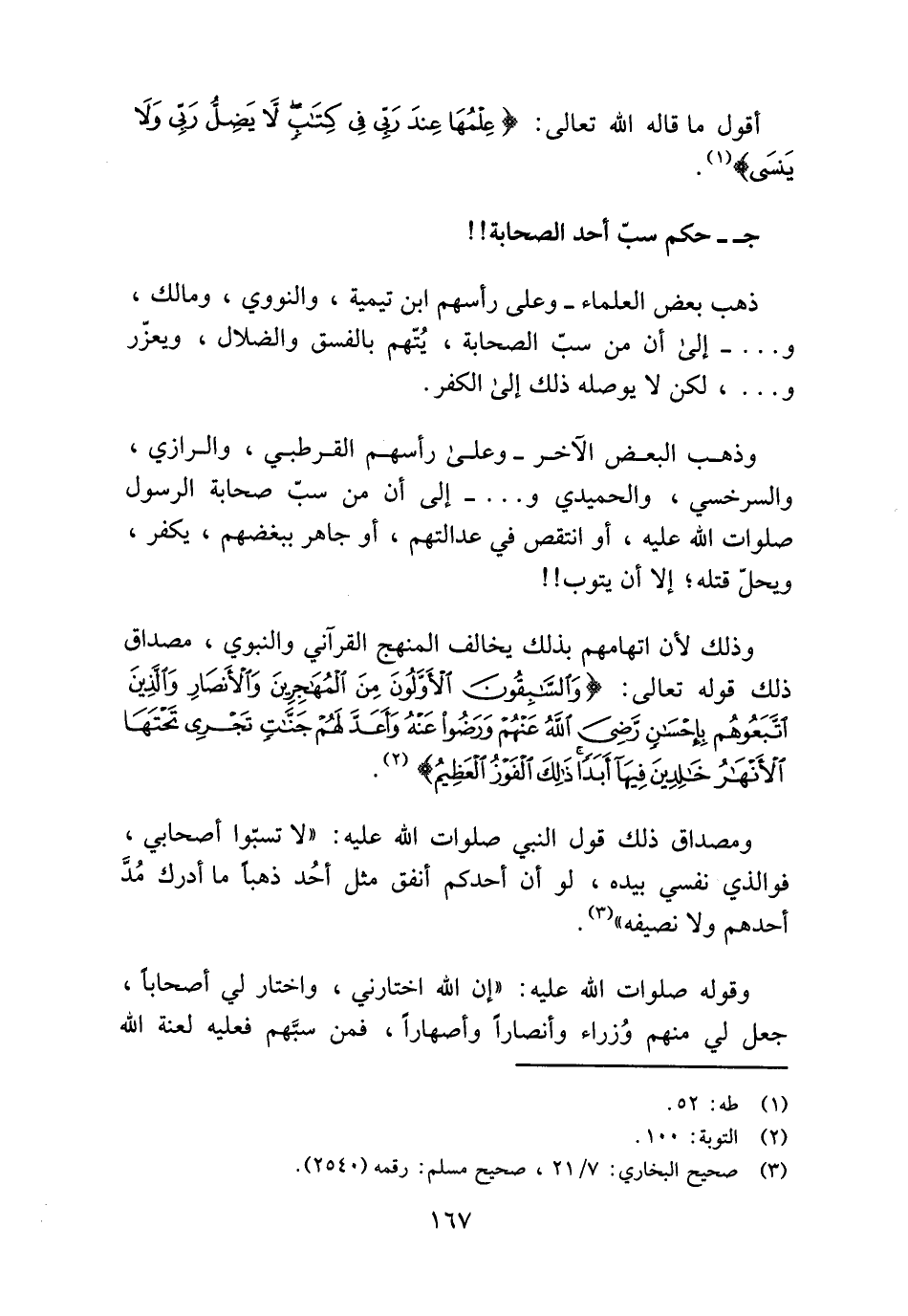 وذلك لأن اتهامهم بذلك يخالف المنهج القرآني والنبوي، مصداق ذلك قوله تعالى: (وَالسَّابِقُونَ الْأَوَّلُونَ مِنَ الْمُهاجِرِينَ وَالْأَنْصارِ وَالَّذِينَ اتَّبَعُوهُمْ بِإِحْسانٍ رَضِيَ اللَّهُ عَنْهُمْ وَرَضُوا عَنْهُ وَأَعَدَّ لَهُمْ جَنَّاتٍ تَجْرِي تَحْتَهَا الْأَنْهارُ خالِدِينَ فِيها أَبَداً ذلِكَ الْفَوْزُ الْعَظِيمُ) (¬2).