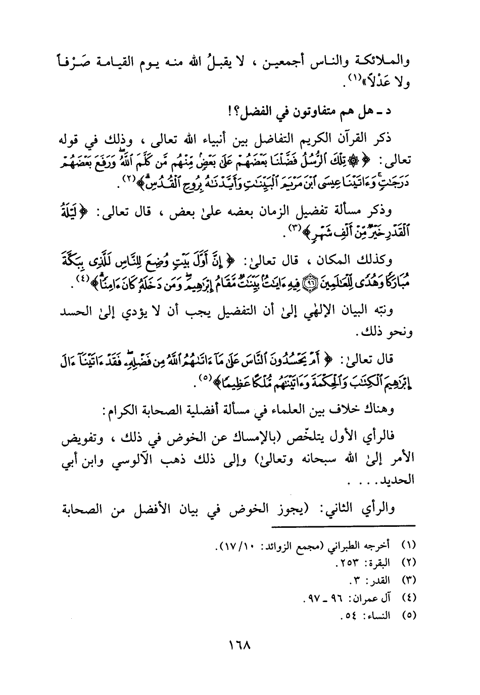ذكر القرآن الكريم التفاضل بين أنبياء الله تعالى، وذلك في قوله تعالى: (تِلْكَ الرُّسُلُ فَضَّلْنا بَعْضَهُمْ عَلى بَعْضٍ مِنْهُمْ مَنْ كَلَّمَ اللَّهُ وَرَفَعَ بَعْضَهُمْ دَرَجاتٍ وَآتَيْنا عِيسَى ابْنَ مَرْيَمَ الْبَيِّناتِ وَأَيَّدْناهُ بِرُوحِ الْقُدُسِ) (¬2).