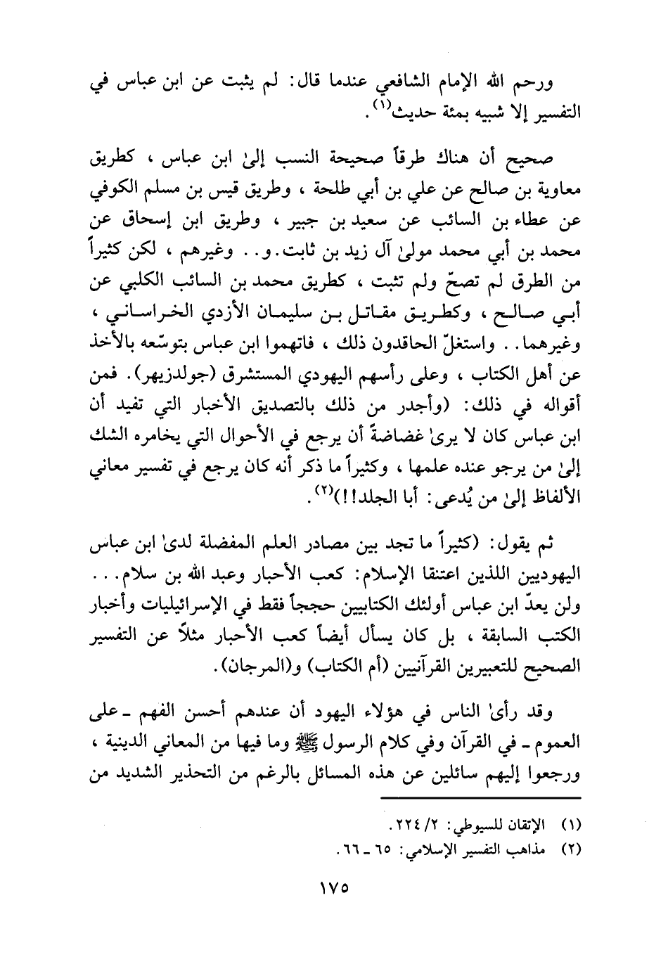 ثم يقول: (كثيرا ما تجد بين مصادر العلم المفضلة لدى ابن عباس اليهوديين اللذين اعتنقا الإسلام: كعب الأحبار وعبد الله بن سلام ...