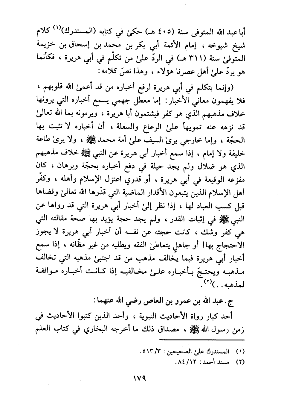 أبا عبد الله المتوفى سنة (405 هـ) حكى في كتابه (المستدرك) (¬1) كلام شيخ شيوخه، إمام الأئمة أبي بكر بن محمد بن إسحاق بن خزيمة المتوفى سنة (311 هـ) في الردّ على من تكلّم في أبي هريرة، فكأنما هو يردّ على أهل عصرنا هؤلاء، وهذا نصّ كلامه: