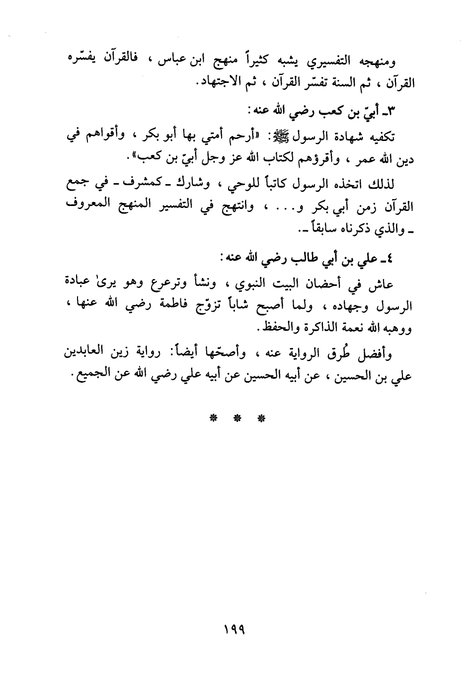 لذلك اتخذه الرسول كاتبا للوحي، وشارك- كمشرف- في جمع القرآن زمن أبي بكر و ... ، وانتهج في التفسير المنهج المعروف- والذي ذكرناه سابقا-.