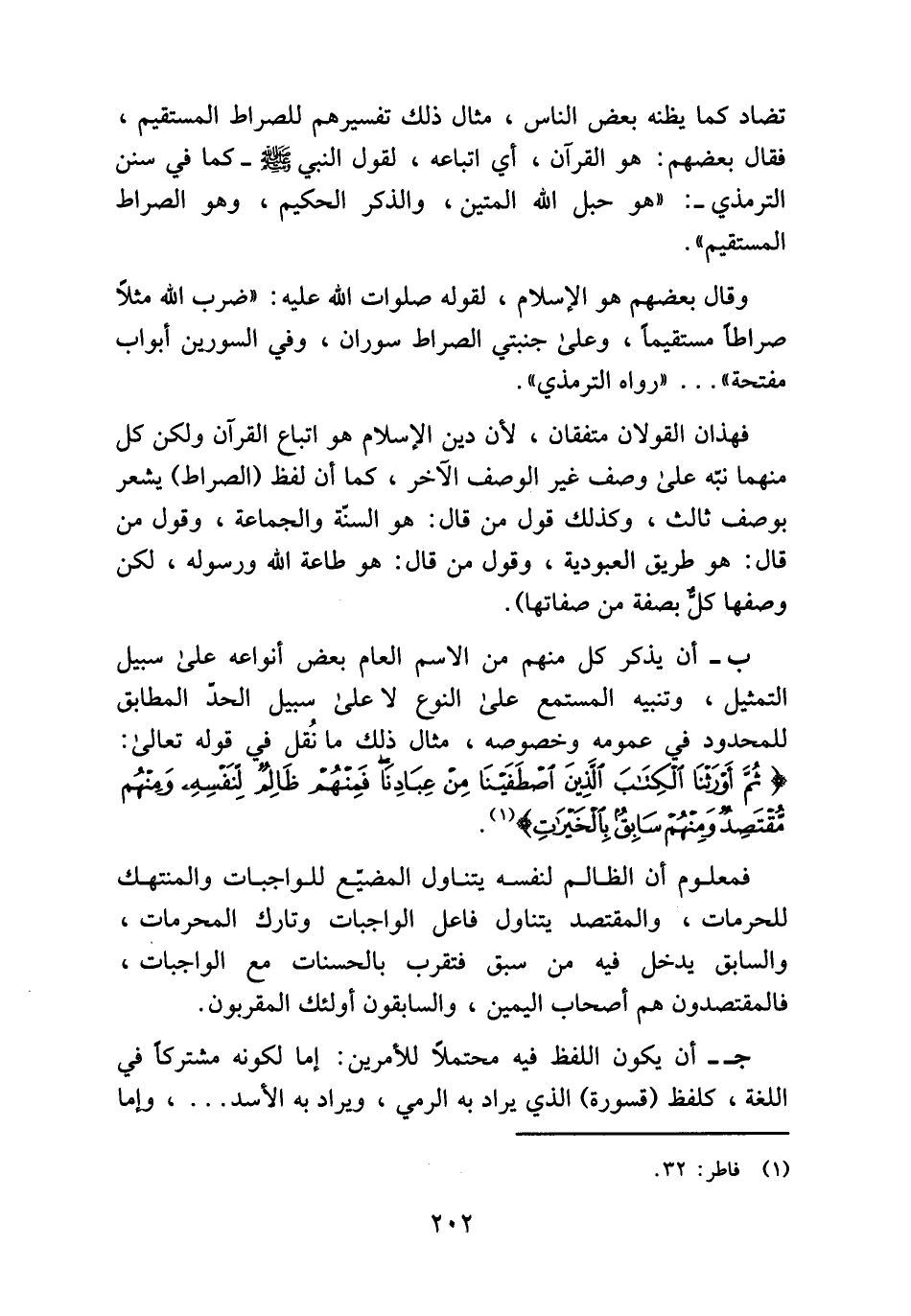 (ثُمَّ أَوْرَثْنَا الْكِتابَ الَّذِينَ اصْطَفَيْنا مِنْ عِبادِنا فَمِنْهُمْ ظالِمٌ لِنَفْسِهِ وَمِنْهُمْ مُقْتَصِدٌ وَمِنْهُمْ سابِقٌ بِالْخَيْراتِ) (¬1).