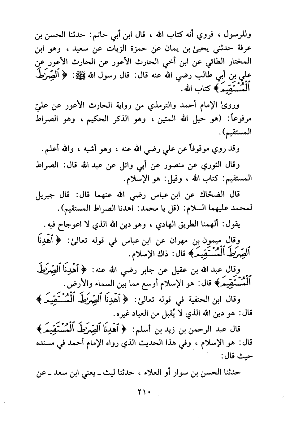 وقال ابن الحنفية في قوله تعالى: (اهْدِنَا الصِّراطَ الْمُسْتَقِيمَ) قال: هو دين الله الذي لا يقبل من العباد غيره.