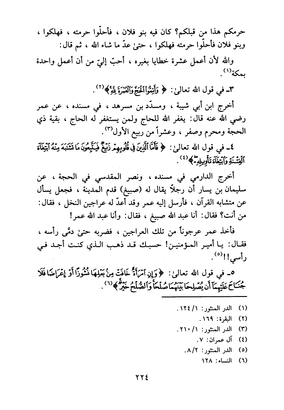 أخرج الدارمي في مسنده، ونصر المقدسي في الحجة، عن سليمان بن يسار أن رجلا يقال له (صبيغ) قدم المدينة، فجعل يسأل عن متشابه القرآن، فأرسل إليه عمر وقد أعدّ له عراجين النخل، فقال:
