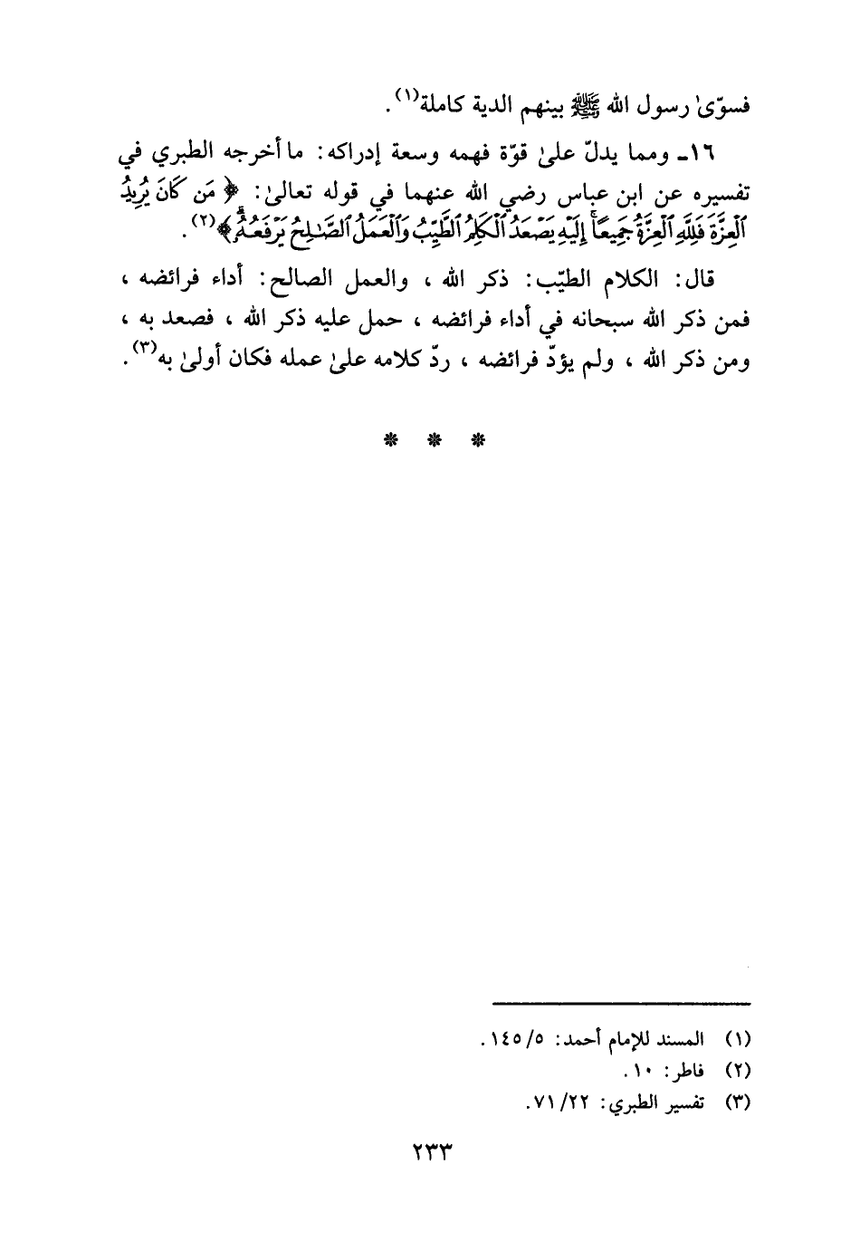 16 - ومما يدلّ على قوّة فهمه وسعة إدراكه: ما أخرجه الطبري في تفسيره عن ابن عباس رضي الله عنهما في قوله تعالى: (مَنْ كانَ يُرِيدُ الْعِزَّةَ فَلِلَّهِ الْعِزَّةُ جَمِيعاً إِلَيْهِ يَصْعَدُ الْكَلِمُ الطَّيِّبُ وَالْعَمَلُ الصَّالِحُ يَرْفَعُهُ) (¬2).