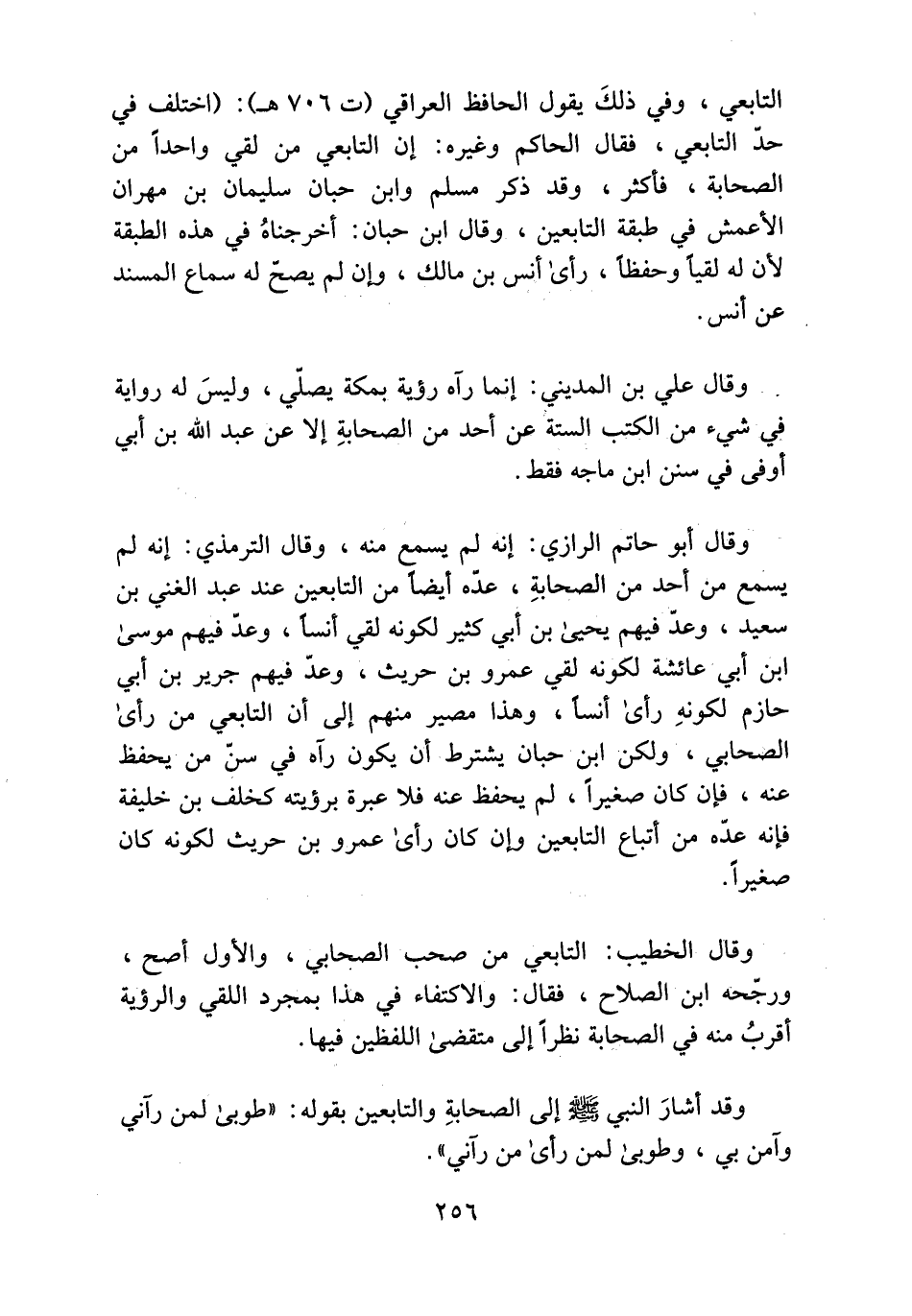 وقال الخطيب: التابعي من صحب الصحابي، والأول أصح، ورجّحه ابن الصلاح، فقال: والاكتفاء في هذا بمجرد اللقي والرؤية أقرب منه في الصحابة نظرا إلى مقتضى اللفظين فيها.