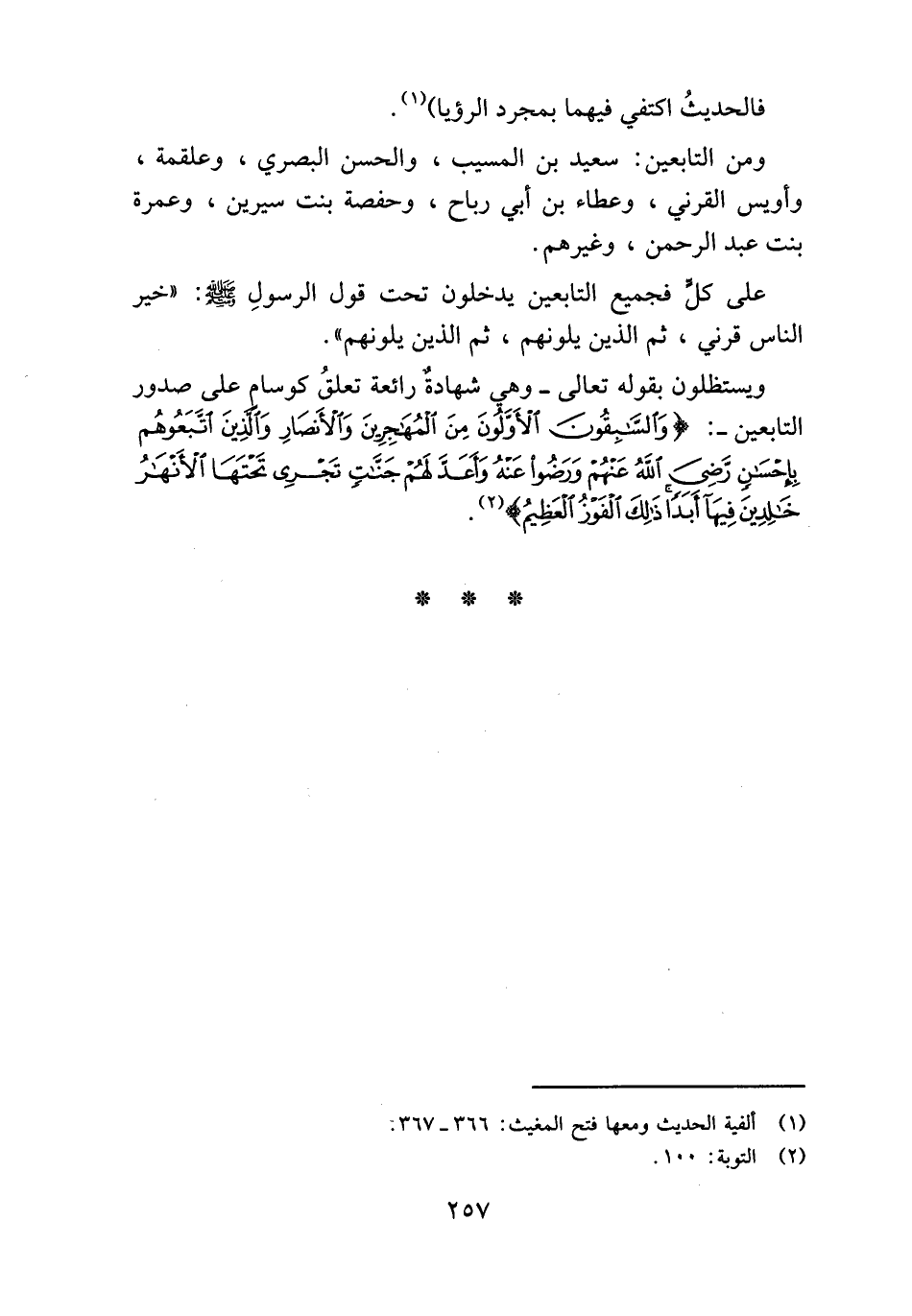 ويستظلون بقوله تعالى- وهي شهادة رائعة تعلق كوسام على صدور التابعين-: (وَالسَّابِقُونَ الْأَوَّلُونَ مِنَ الْمُهاجِرِينَ وَالْأَنْصارِ وَالَّذِينَ اتَّبَعُوهُمْ بِإِحْسانٍ رَضِيَ اللَّهُ عَنْهُمْ وَرَضُوا عَنْهُ وَأَعَدَّ لَهُمْ جَنَّاتٍ تَجْرِي تَحْتَهَا الْأَنْهارُ خالِدِينَ فِيها أَبَداً ذلِكَ الْفَوْزُ الْعَظِيمُ) (¬2).