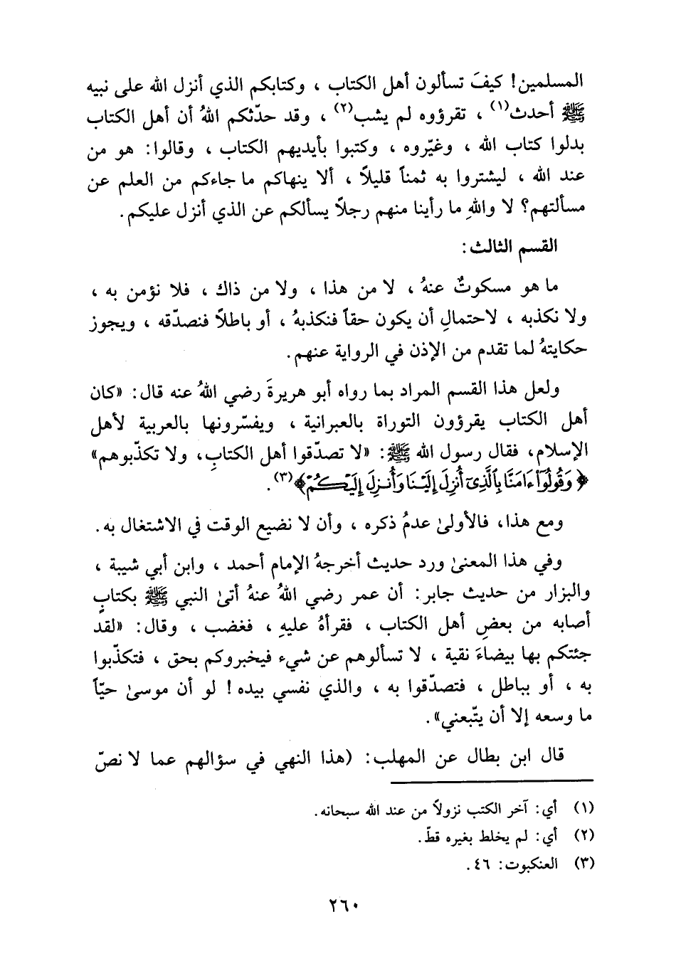 ولعل هذا القسم المراد بما رواه أبو هريرة رضي الله عنه قال: «كان أهل الكتاب يقرءون التوراة بالعبرانية، ويفسّرونها بالعربية لأهل الإسلام، فقال رسول الله صلى الله عليه وسلم: «لا تصدّقوا أهل الكتاب، ولا تكذّبوهم» (وَقُولُوا آمَنَّا بِالَّذِي أُنْزِلَ إِلَيْنا وَأُنْزِلَ إِلَيْكُمْ) (¬3).