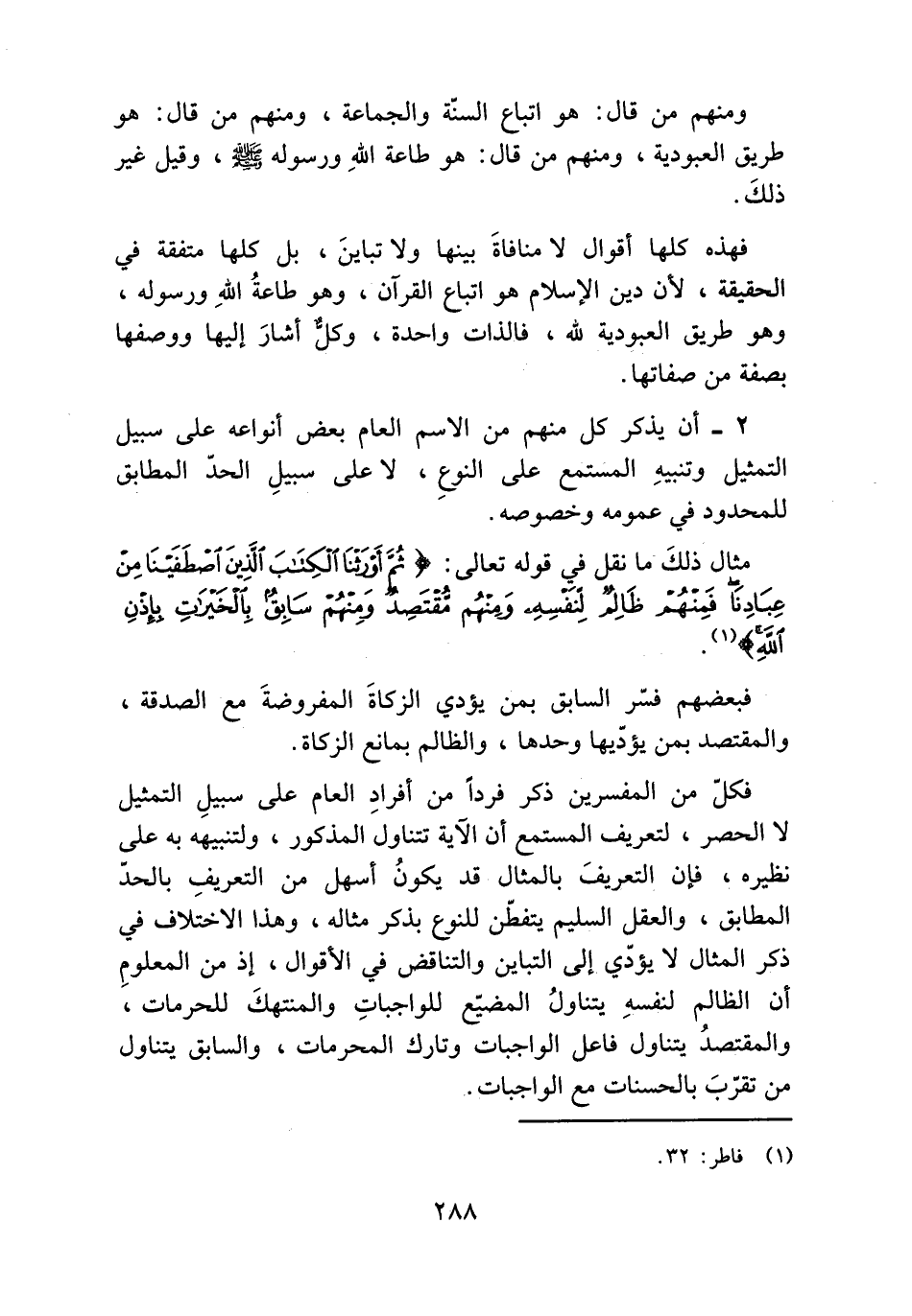 فهذه كلها أقوال لا منافاة بينها ولا تباين، بل كلها متفقة في الحقيقة، لأن دين الإسلام هو اتباع القرآن، وهو طاعة الله ورسوله، وهو طريق العبودية لله، فالذات واحدة، وكلّ أشار إليها ووصفها بصفة من صفاتها.