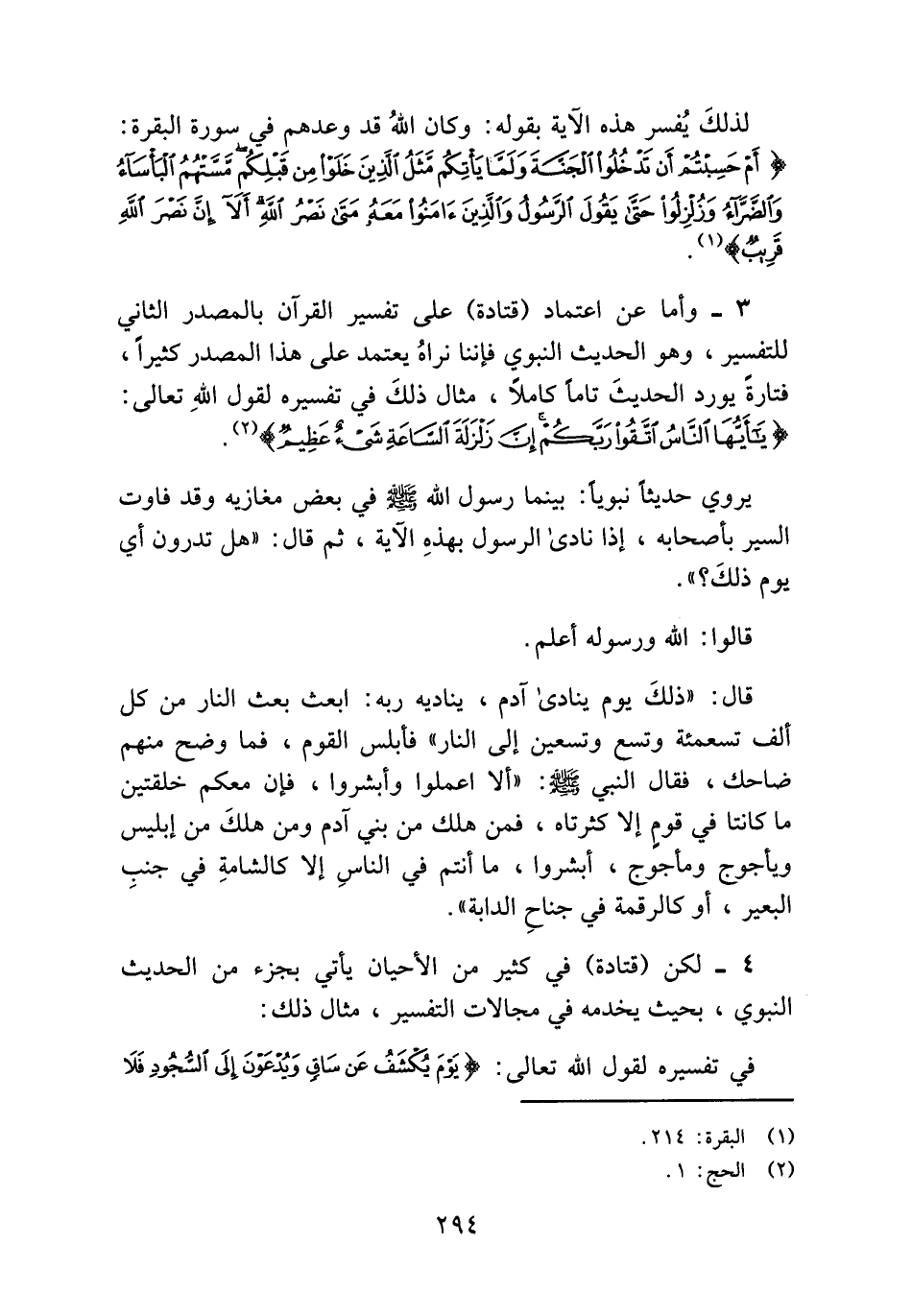 4 - لكن (قتادة) في كثير من الأحيان يأتي بجزء من الحديث النبوي، بحيث يخدمه في مجالات التفسير، مثال ذلك: