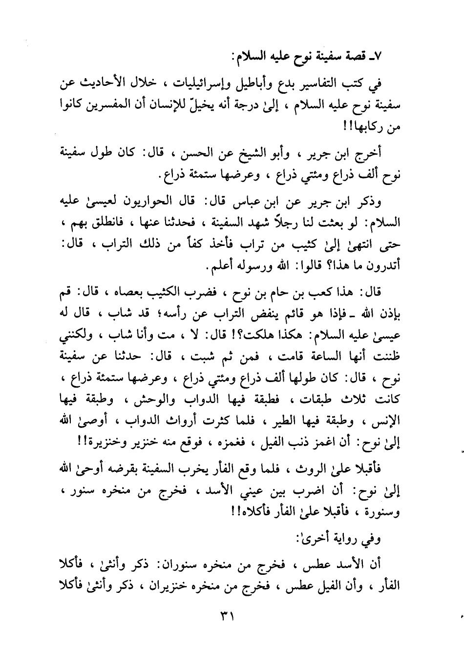 في كتب التفاسير بدع وأباطيل وإسرائيليات، خلال الأحاديث عن سفينة نوح عليه السلام، إلى درجة أنه يخيّل للإنسان أن المفسرين كانوا من ركابها!!