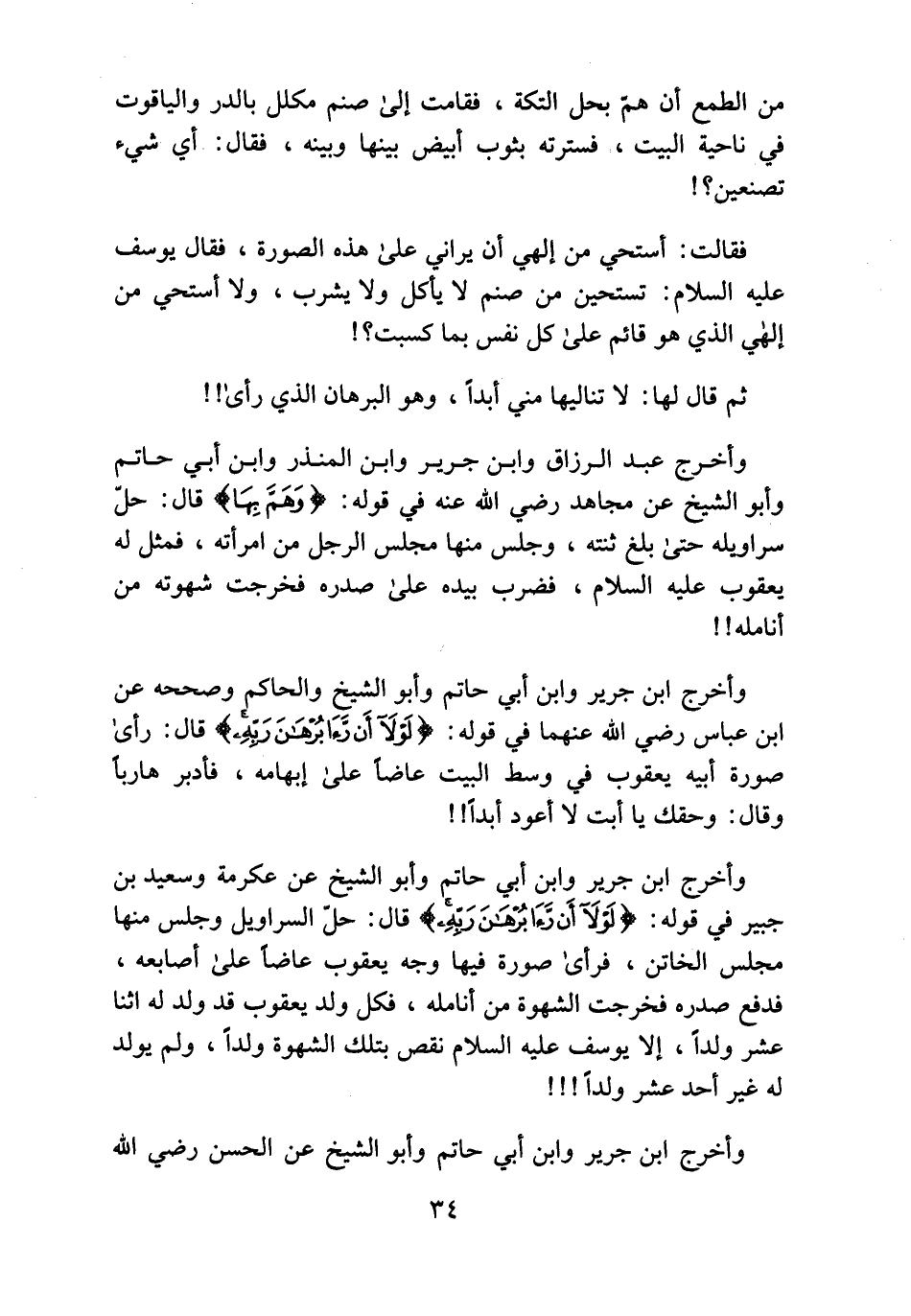 وأخرج ابن جرير وابن أبي حاتم وأبو الشيخ والحاكم وصححه عن ابن عباس رضي الله عنهما في قوله: (لَوْلا أَنْ رَأى بُرْهانَ رَبِّهِ) قال: رأى صورة أبيه يعقوب في وسط البيت عاضا على إبهامه، فأدبر هاربا وقال: وحقك يا أبت لا أعود أبدا!!