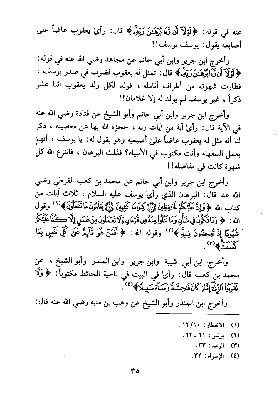 وأخرج ابن جرير وابن أبي حاتم عن محمد بن كعب القرطي رضي الله عنه قال: البرهان الذي رأى يوسف عليه السلام، ثلاث آيات من كتاب الله (وَإِنَّ عَلَيْكُمْ لَحافِظِينَ (10) كِراماً كاتِبِينَ (11) يَعْلَمُونَ ما تَفْعَلُونَ) (¬1) وقول الله: (وَما تَكُونُ فِي شَأْنٍ وَما تَتْلُوا مِنْهُ مِنْ قُرْآنٍ وَلا تَعْمَلُونَ مِنْ عَمَلٍ إِلَّا كُنَّا عَلَيْكُمْ شُهُوداً إِذْ تُفِيضُونَ فِيهِ) (¬2) وقوله الله: (أَفَمَنْ هُوَ قائِمٌ عَلى كُلِّ نَفْسٍ بِما كَسَبَتْ) (¬3).