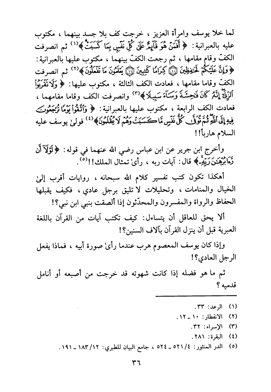 (وَإِنَّ عَلَيْكُمْ لَحافِظِينَ (10) كِراماً كاتِبِينَ (11) يَعْلَمُونَ ما تَفْعَلُونَ) (¬2) ثم انصرفت الكفّ وقاما مقامها، فعادت الكف الثالثة، مكتوب عليها: (وَلا تَقْرَبُوا الزِّنى إِنَّهُ كانَ فاحِشَةً وَساءَ سَبِيلًا) (¬3) وانصرفت الكف وقاما مقامهما، فعادت الكف الرابعة، مكتوب عليها بالعبرانية: (وَاتَّقُوا يَوْماً تُرْجَعُونَ فِيهِ إِلَى اللَّهِ ثُمَّ تُوَفَّى كُلُّ نَفْسٍ ما كَسَبَتْ وَهُمْ لا يُظْلَمُونَ) (¬4) فولى يوسف عليه السلام هاربا!!