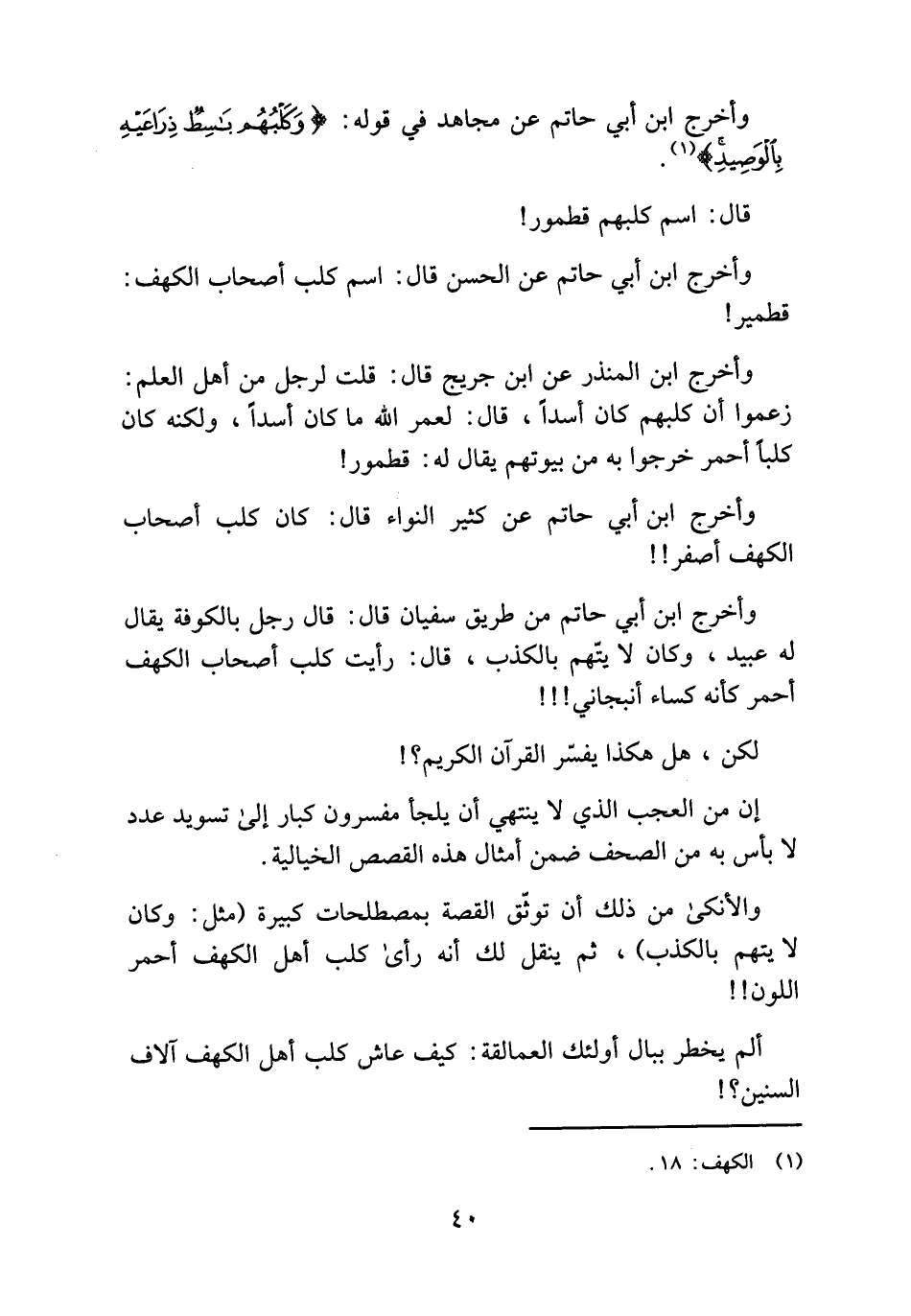 وأخرج ابن أبي من طريق سفيان قال: قال رجل بالكوفة يقال له عبيد، وكان لا يتّهم بالكذب، قال: رأيت كلب أصحاب الكهف أحمر كأنه كساء أنبجاني!!!