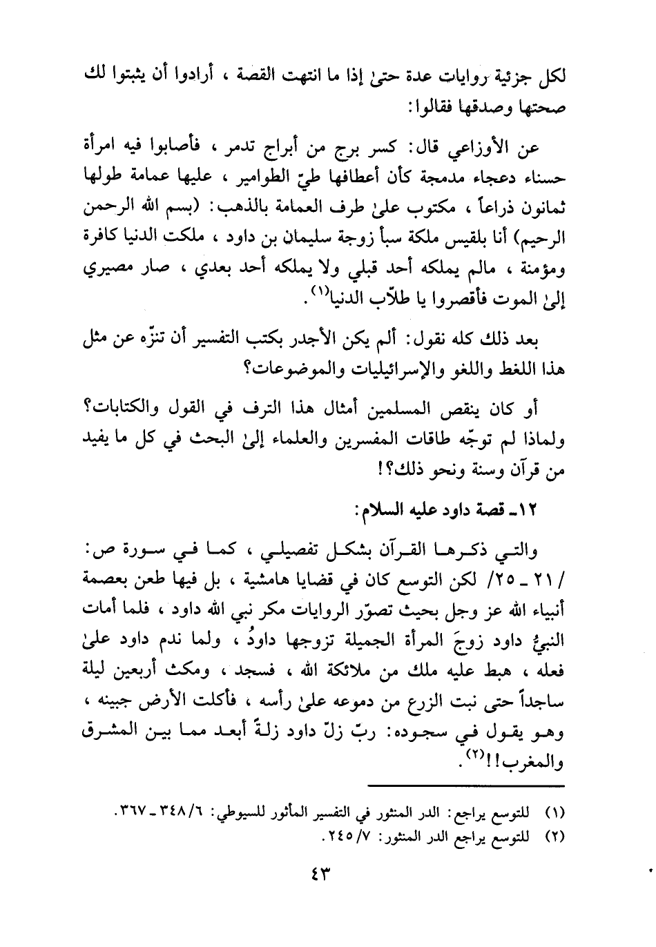 / 21 - 25/ لكن التوسع كان في قضايا هامشية، بل فيها طعن بعصمة أنبياء الله عز وجل بحيث تصوّر الروايات مكر نبي الله داود، فلما أمات النبيّ داود زوج المرأة الجميلة تزوجها داود، ولما ندم داود على فعله، هبط عليه ملك من ملائكة الله، فسجد، ومكث أربعين ليلة ساجدا حتى نبت الزرع من دموعه على رأسه، فأكلت الأرض جبينه، وهو يقول في سجوده: ربّ زلّ داود زلة أبعد مما بين المشرق والمغرب!! (¬2).