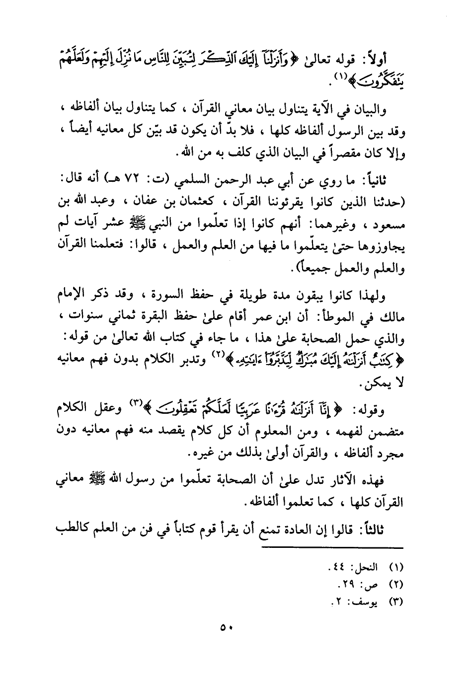 فهذه الآثار تدل على أن الصحابة تعلّموا من رسول الله صلى الله عليه وسلم معاني القرآن كلها، كما تعلموا ألفاظه.
