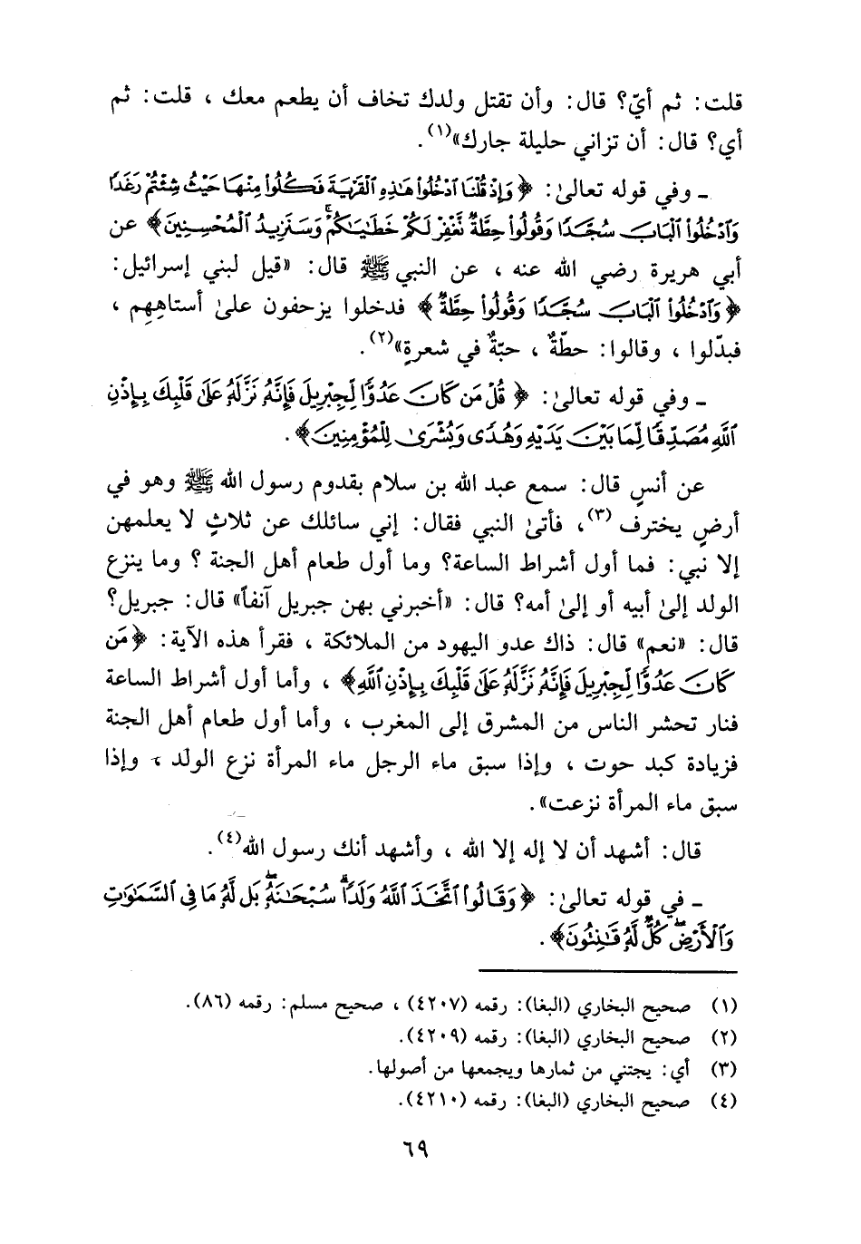 قال: «نعم» قال: ذاك عدو اليهود من الملائكة، فقرأ هذه الآية: (مَنْ كانَ عَدُوًّا لِجِبْرِيلَ فَإِنَّهُ نَزَّلَهُ عَلى قَلْبِكَ بِإِذْنِ اللَّهِ)، وأما أول أشراط الساعة فنار تحشر الناس من المشرق إلى المغرب، وأما أول طعام أهل الجنة فزيادة كبد حوت، وإذا سبق ماء الرجل ماء المرأة نزع الولد، وإذا سبق ماء المرأة نزعت».