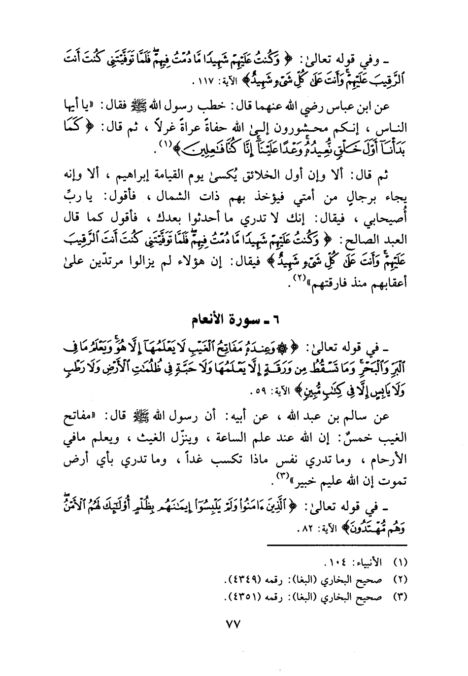 ثم قال: ألا وإن أول الخلائق يكسى يوم القيامة إبراهيم، ألا وإنه يجاء برجال من أمتي فيؤخذ بهم ذات الشمال، فأقول: يا ربّ أصيحابي، فيقال: إنك لا تدري ما أحدثوا بعدك، فأقول كما قال العبد الصالح: (وَكُنْتُ عَلَيْهِمْ شَهِيداً ما دُمْتُ فِيهِمْ فَلَمَّا تَوَفَّيْتَنِي كُنْتَ أَنْتَ الرَّقِيبَ عَلَيْهِمْ وَأَنْتَ عَلى كُلِّ شَيْءٍ شَهِيدٌ) فيقال: إن هؤلاء لم يزالوا مرتدّين على أعقابهم منذ فارقتهم» (¬2).