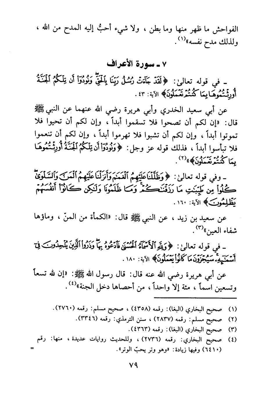 عن أبي هريرة رضي الله عنه قال: قال رسول الله صلى الله عليه وسلم: «إن لله تسعا وتسعين اسما، مائة إلا واحدا، من أحصاها دخل الجنة» (¬4).