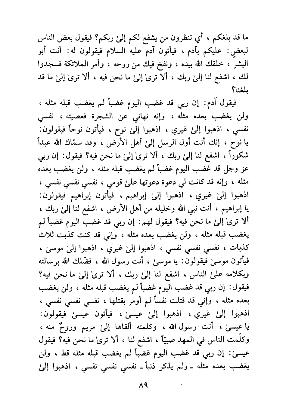 يا عيسى، أنت رسول الله، وكلمته ألقاها إلى مريم وروح منه، وكلّمت الناس في المهد صبيّا، اشفع لنا، ألا ترى ما نحن فيه؟ فيقول عيسى: إن ربي قد غضب اليوم غضبا لم يغضب قبله مثله قط، ولن يغضب بعده مثله- ولم يذكر ذنبا- نفسي نفسي نفسي، اذهبوا إلى