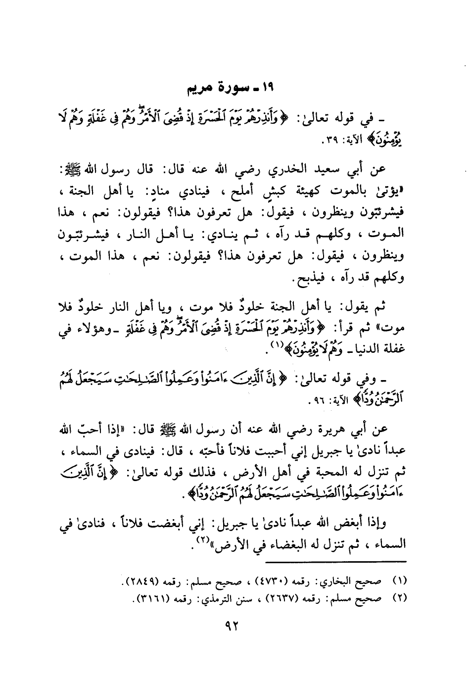 ثم يقول: يا أهل الجنة خلود فلا موت، ويا أهل النار خلود فلا موت» ثم قرأ: (وَأَنْذِرْهُمْ يَوْمَ الْحَسْرَةِ إِذْ قُضِيَ الْأَمْرُ وَهُمْ فِي غَفْلَةٍ- وهؤلاء في غفلة الدنيا- وَهُمْ لا يُؤْمِنُونَ) (¬1).
