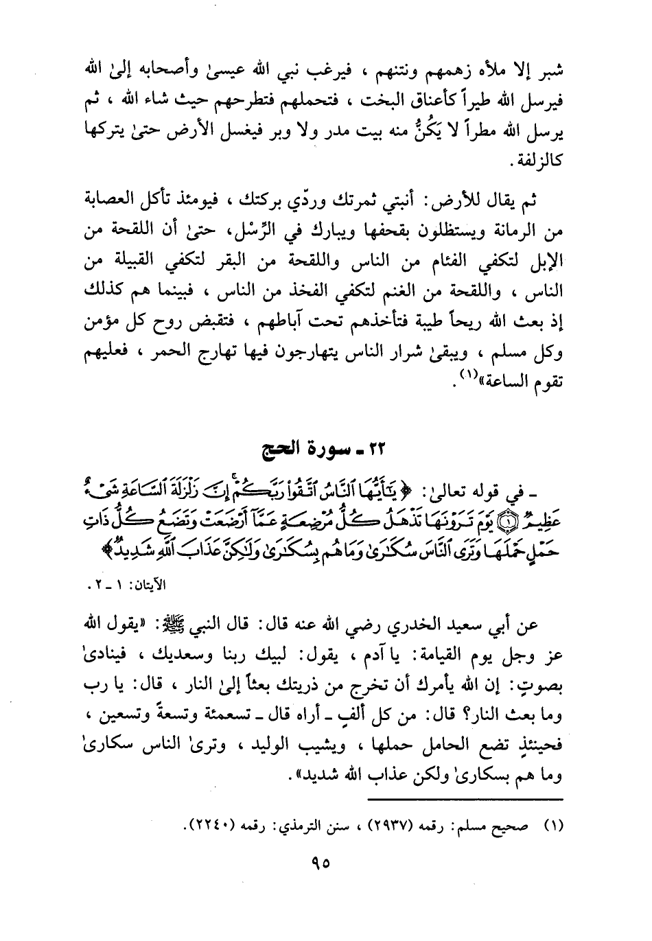 عن أبي سعيد الخدري رضي الله عنه قال: قال النبي صلى الله عليه وسلم: «يقول الله عز وجل يوم القيامة: يا آدم، يقول: لبيك ربنا وسعديك، فينادى بصوت: إن الله يأمرك أن تخرج من ذريتك بعثا إلى النار، قال: يا رب وما بعث النار؟ قال: من كل ألف- أراه قال- تسعمائة وتسعة وتسعين، فحينئذ تضع الحامل حملها، ويشيب الوليد، وترى الناس سكارى وما هم بسكارى ولكن عذاب الله شديد».