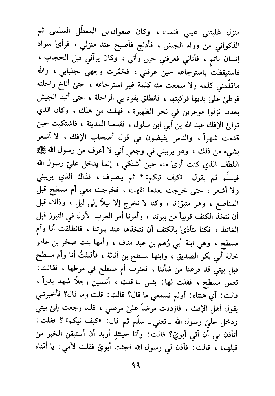 منزل غلبتني عيني فنمت، وكان صفوان بن المعطّل السلمي ثم الذكواني من وراء الجيش، فأدلج فأصبح عند منزلي، فرأى سواد إنسان نائم، فأتاني فعرفني حين رآني، وكان يراني قبل الحجاب، فاستيقظت باسترجاعه حين عرفني، فخمّرت وجهي بجلبابي، والله ما كلّمني كلمة ولا سمعت منه كلمة غير استرجاعه، حتى أناخ راحلته فوطئ على يديها فركبتها، فانطلق يقود بي الراحلة، حتى أتينا الجيش بعد ما نزلوا موغرين في نحر الظهيرة، فهلك من هلك، وكان الذي تولى الإفك عبد الله بن أبي ابن سلول، فقدمنا المدينة، فاشتكيت حين قدمت شهرا، والناس يفيضون في قول أصحاب الإفك، لا أشعر بشيء من ذلك، وهو يريبني في وجعي أني لا أعرف من رسول الله صلى الله عليه وسلم اللطف الذي كنت أرى منه حين أشتكي، إنما يدخل عليّ رسول الله فيسلّم ثم يقول: «كيف تيكم»؟ ثم ينصرف، فذاك الذي يريبني ولا أشعر، حتى خرجت بعد ما نقهت، فخرجت معي أم مسطح قبل المناصع، وهو متبرّزنا، وكنا لا نخرج إلا ليلا إلى ليل، وذلك قبل أن نتخذ الكنف قريبا من بيوتنا، وأمرنا أمر العرب الأول في التبرز قبل الغائط، فكنا نتأذى بالكنف أن نتخذها عند بيوتنا، فانطلقت أنا وأم مسطح، وهي ابنة أبي رهم بن عبد مناف، وأمها بنت صخر بن عامر خالة أبي بكر الصديق، وابنها مسطح بن أثاثة، فأقبلت أنا وأم مسطح قبل بيتي قد فرغنا من شأننا، فعثرت أم مسطح في مرطها، فقالت: