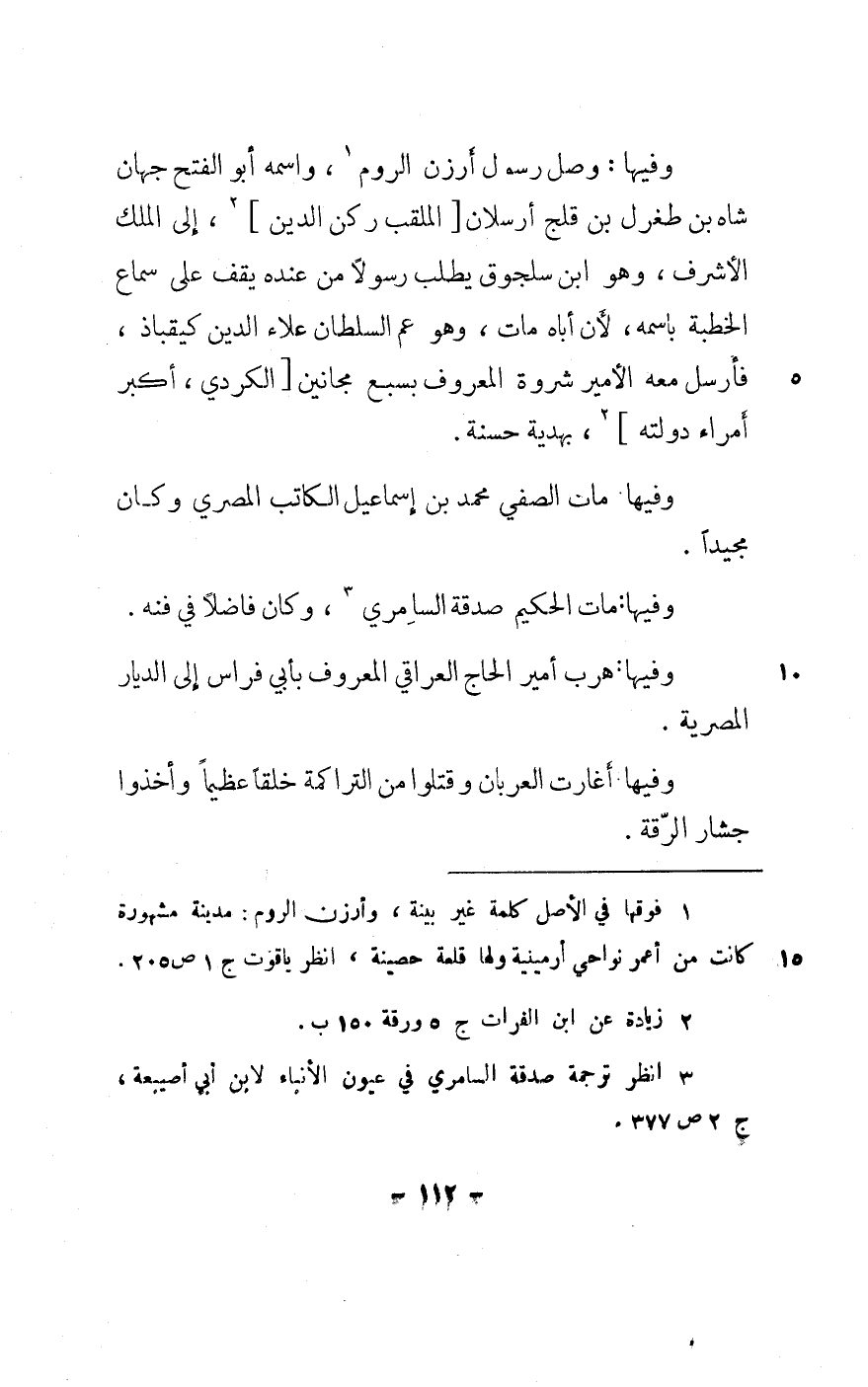 وفيهَا وصل رَسُول أرزن الرّوم واسْمه أَبُو الْفَتْح جهان شاه بن طغرل بن قلج أرسلان الملقب ركن الدّين إِلَى الْملك الْأَشْرَف وَهُوَ ابْن سلجوق يطْلب رَسُولا من عِنْده يقف على سَماع الْخطْبَة باسمه لِأَن أَبَاهُ مَاتَ وَهُوَ عَم السُّلْطَان عَلَاء الدّين كيقباذ فَأرْسل مَعَه الْأَمِير شروة الْمَعْرُوف بِسبع مجانين الْكرْدِي أكبر أُمَرَاء دولته بهدية حَسَنَة