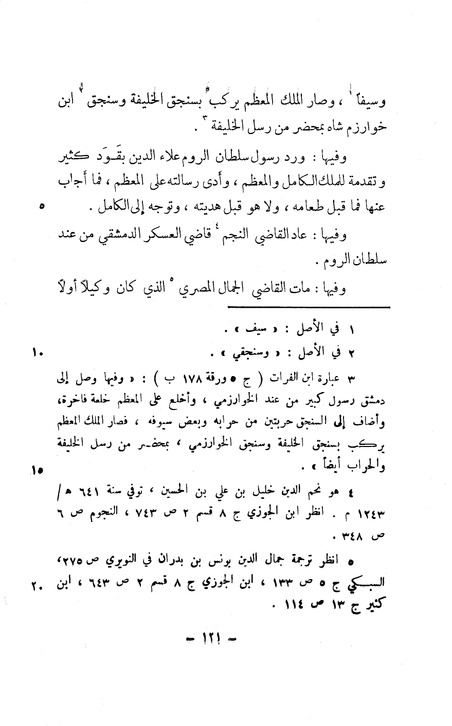وفيهَا ورد رَسُول سُلْطَان الرّوم عَلَاء الدّين بقود كثير وتقدمة للْملك الْكَامِل والمعظم وَأدّى رسَالَته على الْمُعظم فَمَا أجَاب عَنْهَا فَمَا قبل طَعَامه وَلَا هُوَ قبل هديته وَتوجه إِلَى الْكَامِل