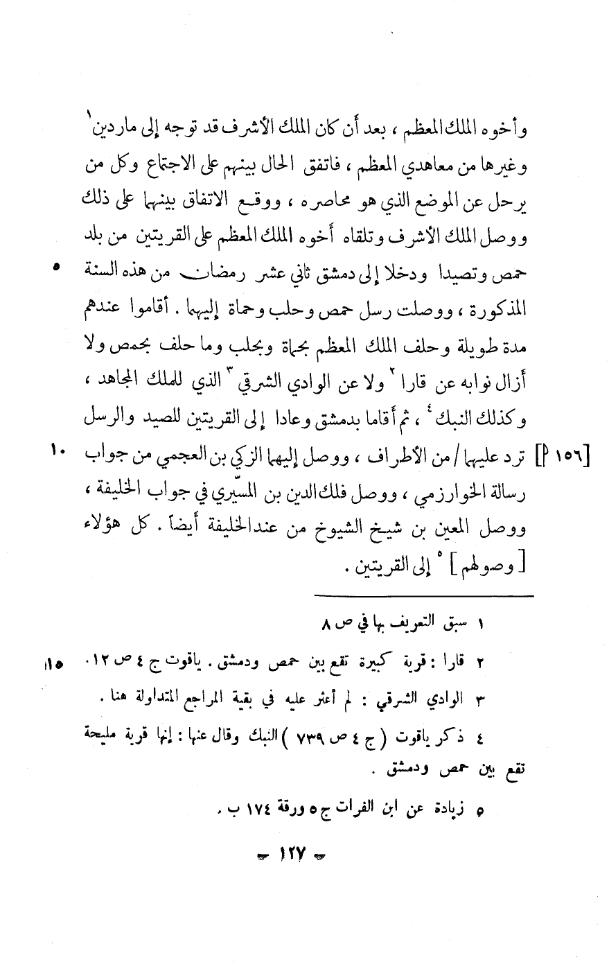 أَقَامُوا عِنْدهم مُدَّة طَوِيلَة وَحلف الْملك الْمُعظم بحماة وبحلب وَمَا حلف بحمص وَلَا أَزَال نوابه عَن قارا وَلَا عَن الْوَادي الشَّرْقِي الَّذِي للْملك الْمُجَاهِد وَكَذَلِكَ النبك ثمَّ أَقَامَا بِدِمَشْق وعادا إِلَى القريتين للصَّيْد وَالرسل ترد عَلَيْهِمَا من الْأَطْرَاف وَوصل إِلَيْهِمَا الزكي بن العجمي من جَوَاب رِسَالَة الْخَوَارِزْمِيّ وَوصل فلك الدّين بن المسيري فِي جَوَاب الْخَلِيفَة وَوصل الْمعِين بن شيخ الشُّيُوخ من عِنْد الْخَلِيفَة أَيْضا