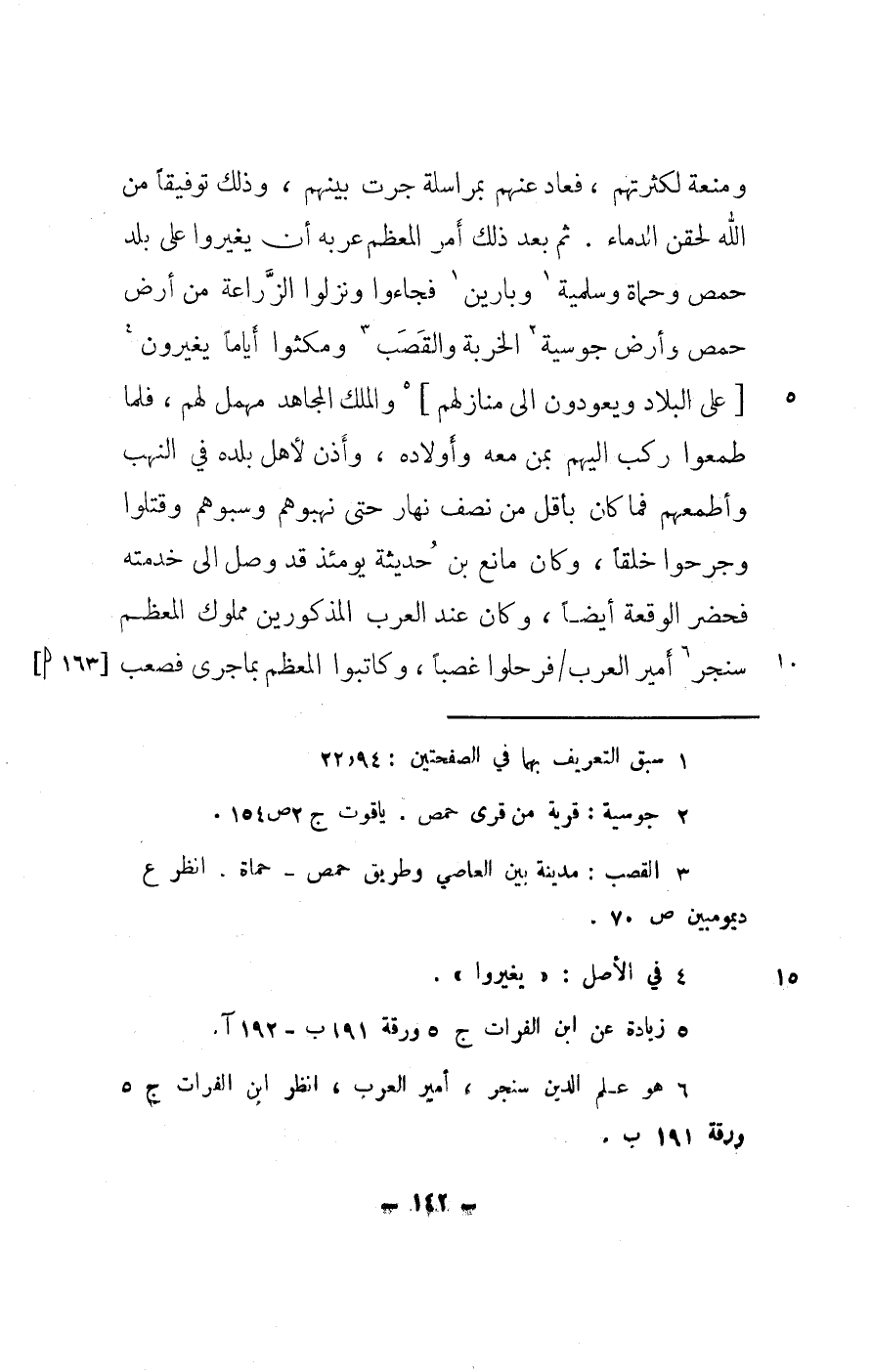 ثمَّ بعد ذَلِك أَمر الْمُعظم عربه أَن يُغيرُوا على بلد حمص وحماة وسلمية وبارين فَجَاءُوا ونزلوا الزِّرَاعَة من أَرض حمص وَأَرْض جوسية الخربة والقصب ومكثوا أَيَّامًا يغيرون على الْبِلَاد ويعودون إِلَى مَنَازِلهمْ وَالْملك الْمُجَاهِد مهمل لَهُم فَلَمَّا طمعوا ركب إِلَيْهِم بِمن مَعَه وَأَوْلَاده وَأذن لأهل بَلَده فِي النهب وأطمعهم فَمَا كَانَ بِأَقَلّ من نصف نَهَار حَتَّى نهبوهم وسبوهم وَقتلُوا وجرحوا خلقا وَكَانَ مَانع بن حَدِيثَة يَوْمئِذٍ قد وصل إِلَى خدمته فَحَضَرَ الْوَقْعَة أَيْضا وَكَانَ عِنْد الْعَرَب الْمَذْكُورين مَمْلُوك الْمُعظم سنجر أَمِير الْعَرَب فرحلوا غصبا وكاتبوا الْمُعظم بِمَا جرى فصعب