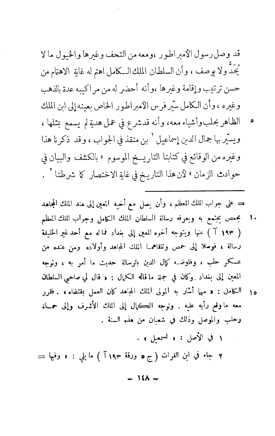 قد وصل رَسُول الأمبراطور وَمَعَهُ من التحف وَغَيرهَا والخيول مَا لَا يحد وَلَا يُوصف وَأَن السُّلْطَان الْملك الْكَامِل اهتم لَهُ غَايَة الاهتمام من حسن تَرْتِيب وَإِقَامَة وَغَيرهَا وَأَنه أحضر لَهُ من مراكبيه عدَّة بِالذَّهَب وَغَيره وَأَن الْكَامِل سير فرس الأمبراطور الْخَاص بِعَيْنِه إِلَى ابْن الْملك الظَّاهِر بحلب وَأَشْيَاء مَعَه وَأَنه قد شرع فِي عمل هَدِيَّة لم يسمع بِمِثْلِهَا ويسير بهَا جمال الدّين إِسْمَاعِيل بن منقذ فِي الْجَواب وَقد ذكرنَا هَذَا وَغَيره من الوقائع فِي كتَابنَا التَّارِيخ الموسوم بالكشف وَالْبَيَان فِي حوادث الزَّمَان لِأَن هَذَا التَّارِيخ فِي غَايَة الِاخْتِصَار كَمَا شرطنا