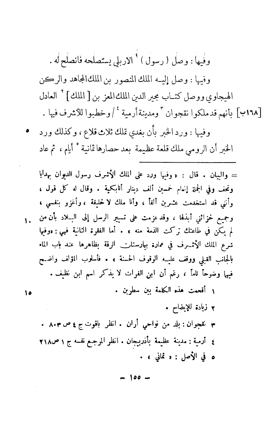 وفيهَا وصل إِلَيْهِ الْملك الْمَنْصُور بن الْملك الْمُجَاهِد والركن الهيجاوي وَوصل كتاب مجير الدّين الْملك الْمعز بن الْملك الْعَادِل بِأَنَّهُم قد ملكوا نقجوان ومدينة أرمية وخطبوا للأشرف فِيهَا