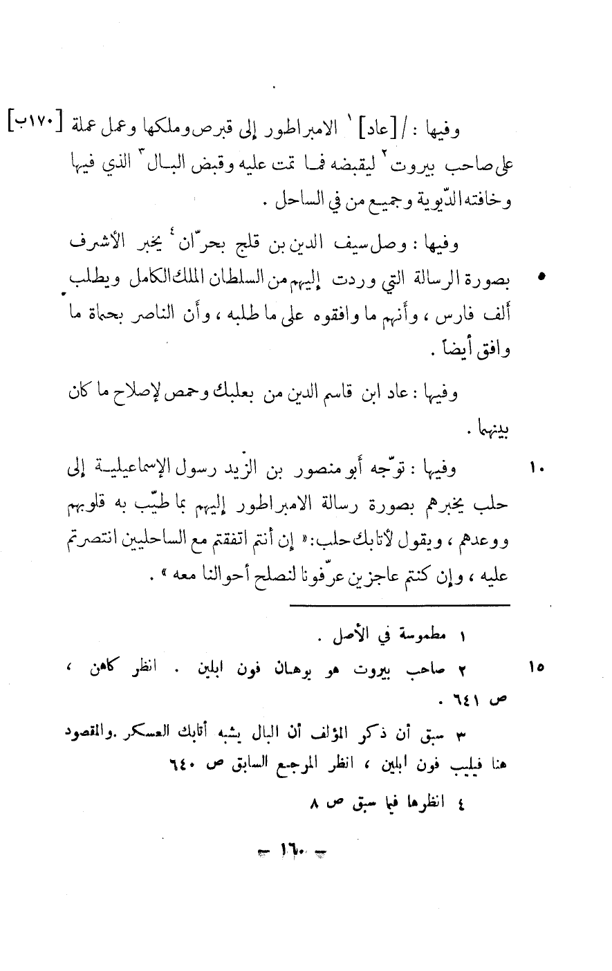 وفيهَا توجه أَبُو مَنْصُور بن الزيد رَسُول الإسماعيلية إِلَى حلب يُخْبِرهُمْ بِصُورَة رِسَالَة الامبراطور إِلَيْهِم بِمَا طيب بِهِ قُلُوبهم وَوَعدهمْ وَيَقُول لأتابك حلب إِن أَنْتُم اتفقتم مَعَ الساحليين انتصرتم عَلَيْهِ وَإِن كُنْتُم عاجزين عرفونا لنصلح أحوالنا مَعَه