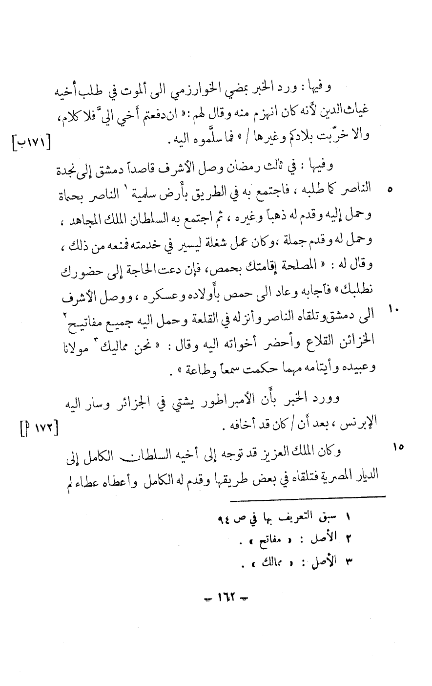 وفيهَا وصل كتاب الْحَاجِب عَليّ وشهاب الدّين غَازِي يخبران أَن الْخَوَارِزْمِيّ وصل إِلَى ملازجرد وكاتبوا الْأَشْرَف بذلك وَهُوَ بِدِمَشْق حَتَّى ان الْحَاجِب عَليّ قَالَ فِي كِتَابه للكمال بن