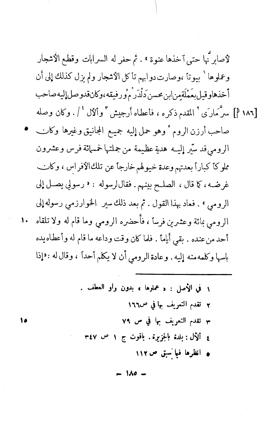وَكَانَ وَصله صَاحب أرزن الرّوم وَهُوَ حمل إِلَيْهِ جَمِيع المجانيق وَغَيرهَا وَكَانَ الرُّومِي قد سير إِلَيْهِ هَدِيَّة عَظِيمَة من جُمْلَتهَا خَمْسمِائَة فرس وَعِشْرُونَ مَمْلُوكا كبارًا بِعدَّتِهِمْ وعدة خيولهم خَارِجا عَن تِلْكَ الأفراس وَكَانَ غَرَضه كَمَا قَالَ الصُّلْح بَينهم