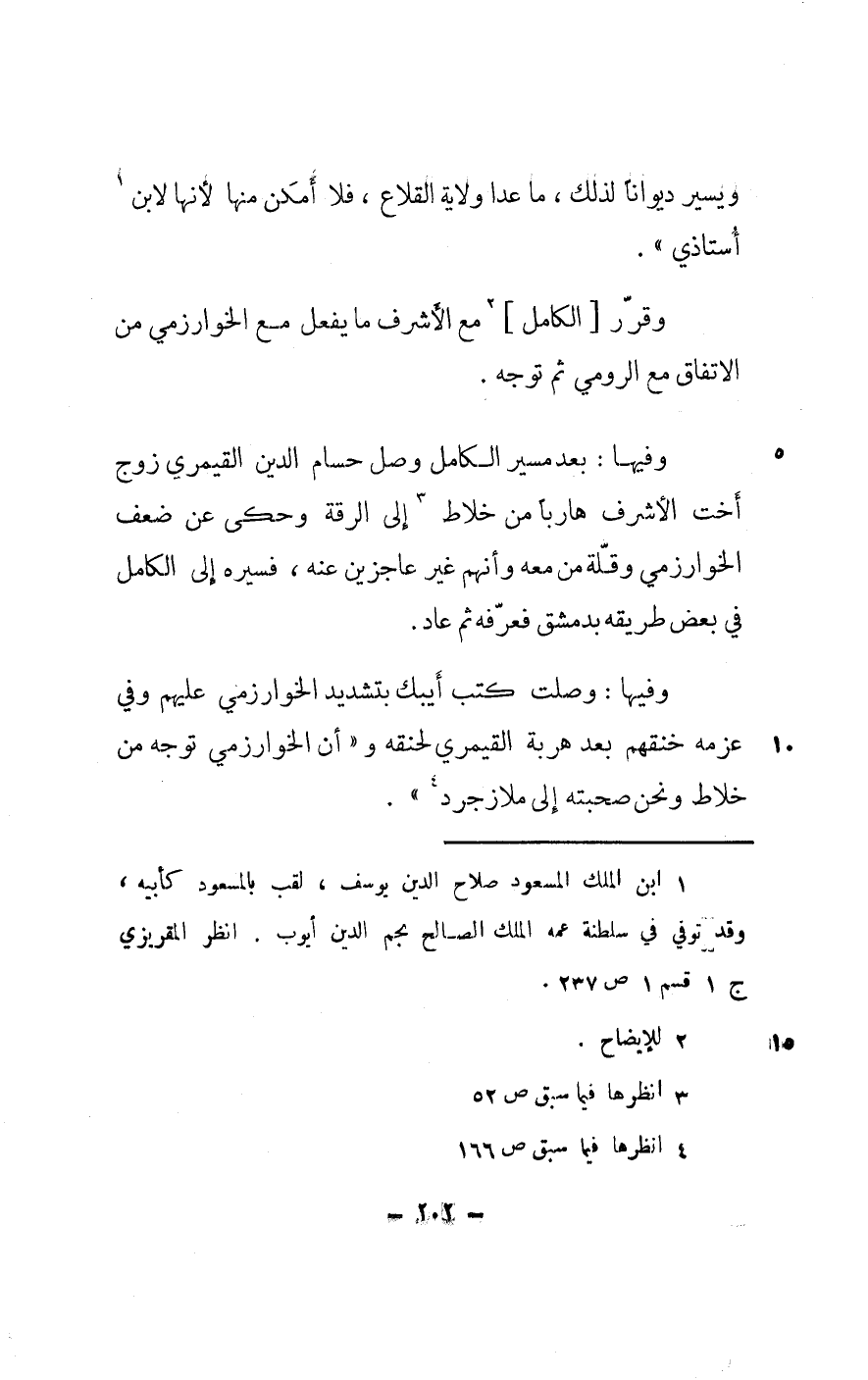 وفيهَا بعد مسير الْكَامِل وصل حسام الدّين القيمري زوج أُخْت الْأَشْرَف هَارِبا من خلاط إِلَى الرقة وَحكى عَن ضعف الْخَوَارِزْمِيّ وَقلة من مَعَه وَأَنَّهُمْ غير عاجزين عَنهُ فسيره إِلَى الْكَامِل فِي بعض طَرِيقه بِدِمَشْق فَعرفهُ ثمَّ عَاد